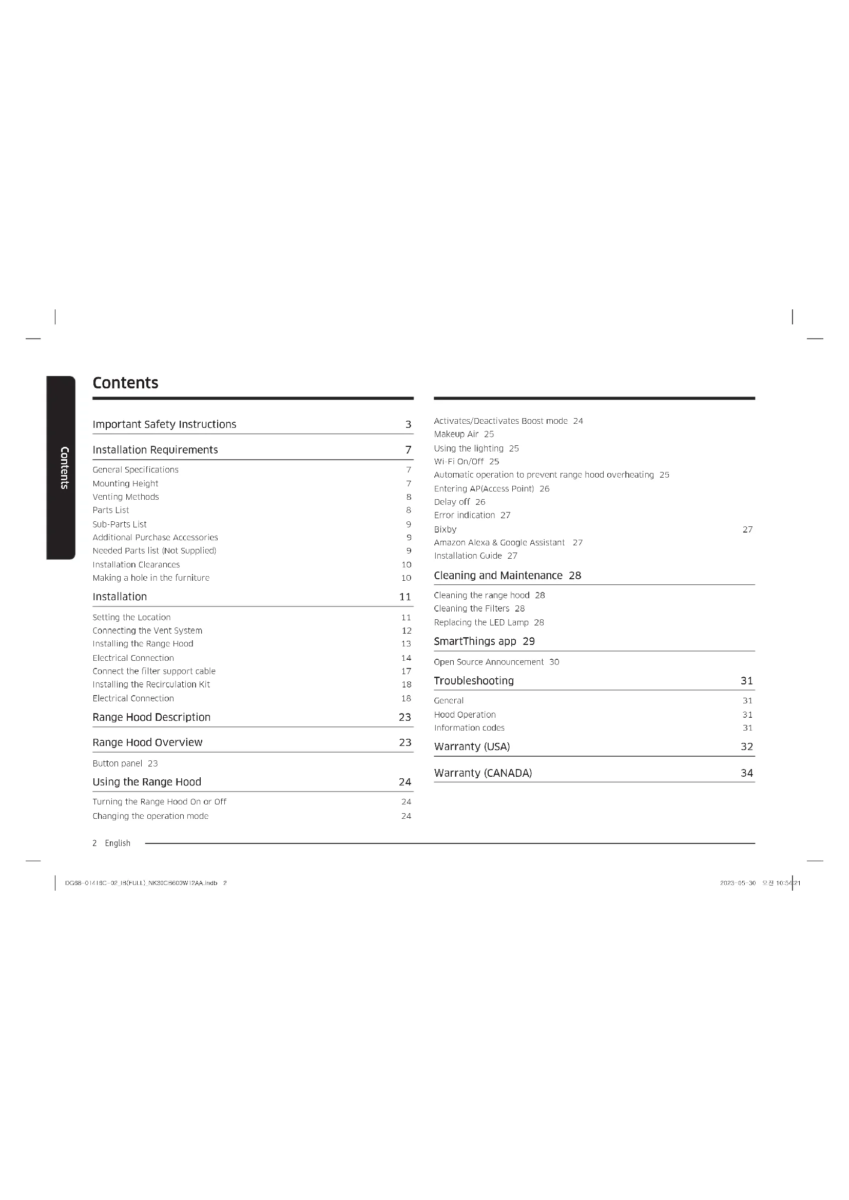 Activates/Deactivates Boost mode 24 Makeup Air 25 Using the lighting 25 Wi-Fi On/Off 25 Automatic operation to prevent range hood overheating 25 Entering AP(Access Point) 26 Delay off 26 Error indication 27 Bixby 27 Amazon Alexa & Google Assistant 27 Installation Guide 27 Cleaning and Maintenance 28 Cleaning the range hood 28 Cleaning the Filters 28 Replacing the LED Lamp 28 SmartThings app 29 Open Source Announcement 30 Troubleshooting 31 General 31 Hood Operation 31 Information codes 31 Warranty (USA) 32 Warranty (CANADA) 34 Contents Important Safety Instructions 3 Installation Requirements 7 General Specifications 7 Mounting Height 7 Venting Methods 8 Parts List 8 Sub-Parts List 9 Additional Purchase Accessories 9 Needed Parts list (Not Supplied) 9 Installation Clearances 10 Making a hole in the furniture 10 Installation 11 Setting the Location 11 Connecting the Vent System 12 Installing the Range Hood 13 Electrical Connection 14 Connect the filter support cable 17 Installing the Recirculation Kit 18 Electrical Connection 18 Range Hood Description 23 Range Hood Overview 23 Button panel 23 Using the Range Hood 24 Turning the Range Hood On or Off 24 Changing the operation mode 24 DG68-01416C-02_IB(FULL)_NK30CB600W12AA.indb 2DG68-01416C-02_IB(FULL)_NK30CB600W12AA.indb 2 2023-05-30 오전 10:54:212023-05-30 오전 10:54:21English 3English 3 Important Safety Instructions