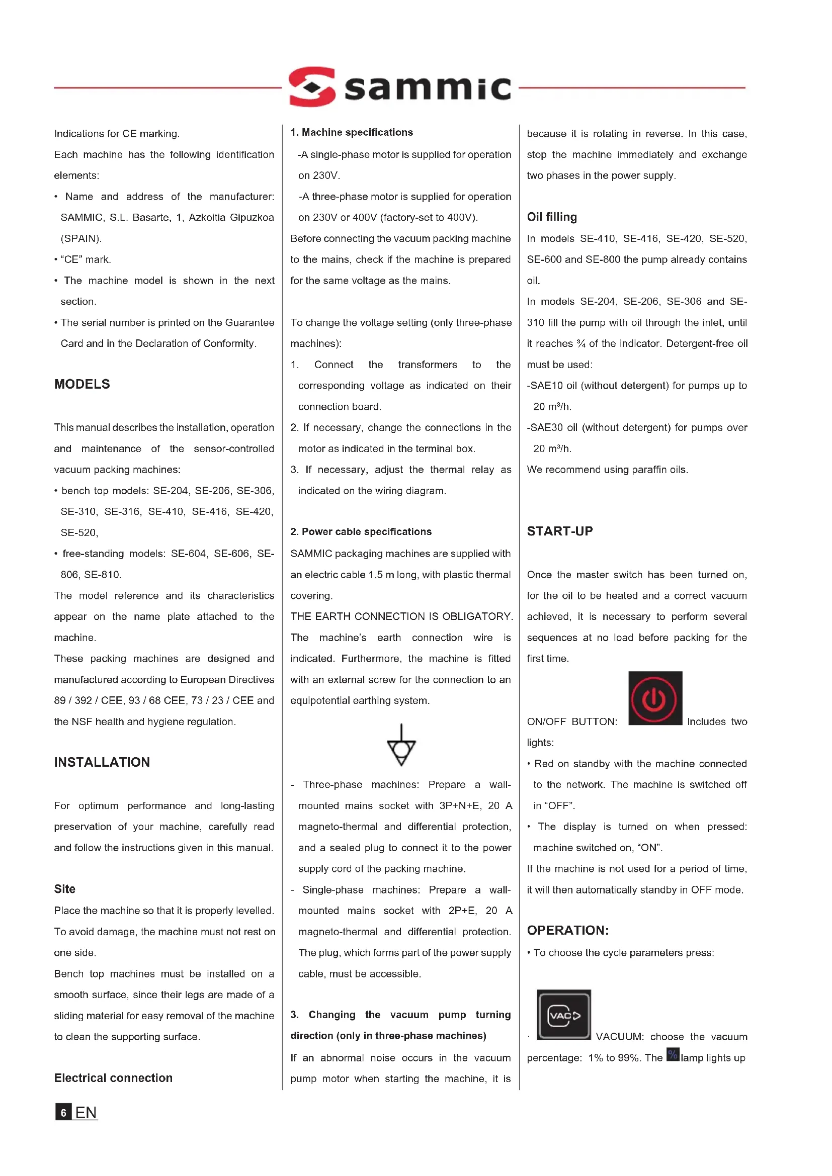direction (only in three-phase machines) If an abnormal noise occurs in the vacuum pump motor when starting the machine, it is because it is rotating in reverse. In this case, stop the machine immediately and exchange two phases in the power supply. Oil filling In models SE-410, SE-416, SE-420, SE-520, SE-600 and SE-800 the pump already contains oil. In models SE-204, SE-206, SE-306 and SE- 310 fill the pump with oil through the inlet, until it reaches ¾ of the indicator. Detergent-free oil must be used: -SAE10 oil (without detergent) for pumps up to 20 m³/h. -SAE30 oil (without detergent) for pumps over 20 m³/h. We recommend using paraffin oils. START-UP Once the master switch has been turned on, for the oil to be heated and a correct vacuum achieved, it is necessary to perform several sequences at no load before packing for the first time. ON/OFF BUTTON: SENSOR Includes two lights: