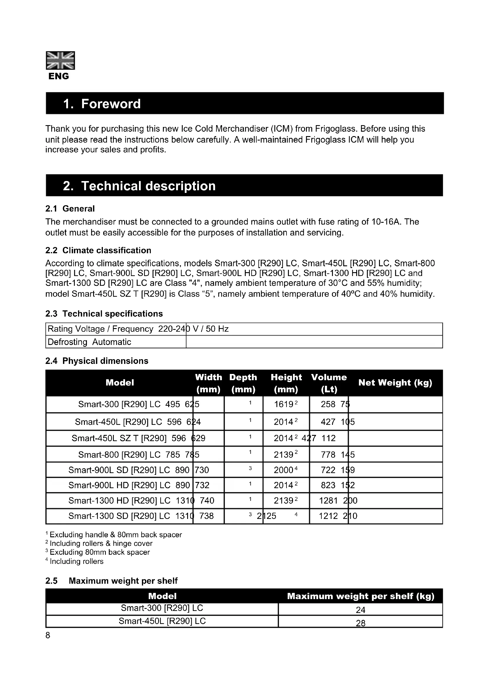 According to climate specifications, models Smart-300 [R290] LC, Smart-450L [R290] LC, Smart-800 [R290] LC, Smart-900L SD [R290] LC, Smart-900L HD [R290] LC, Smart-1300 HD [R290] LC and Smart-1300 SD [R290] LC are Class "4", namely ambient temperature of 30°C and 55% humidity; model Smart-450L SZ T [R290] is Class “5”, namely ambient temperature of 40⁰C and 40% humidity.