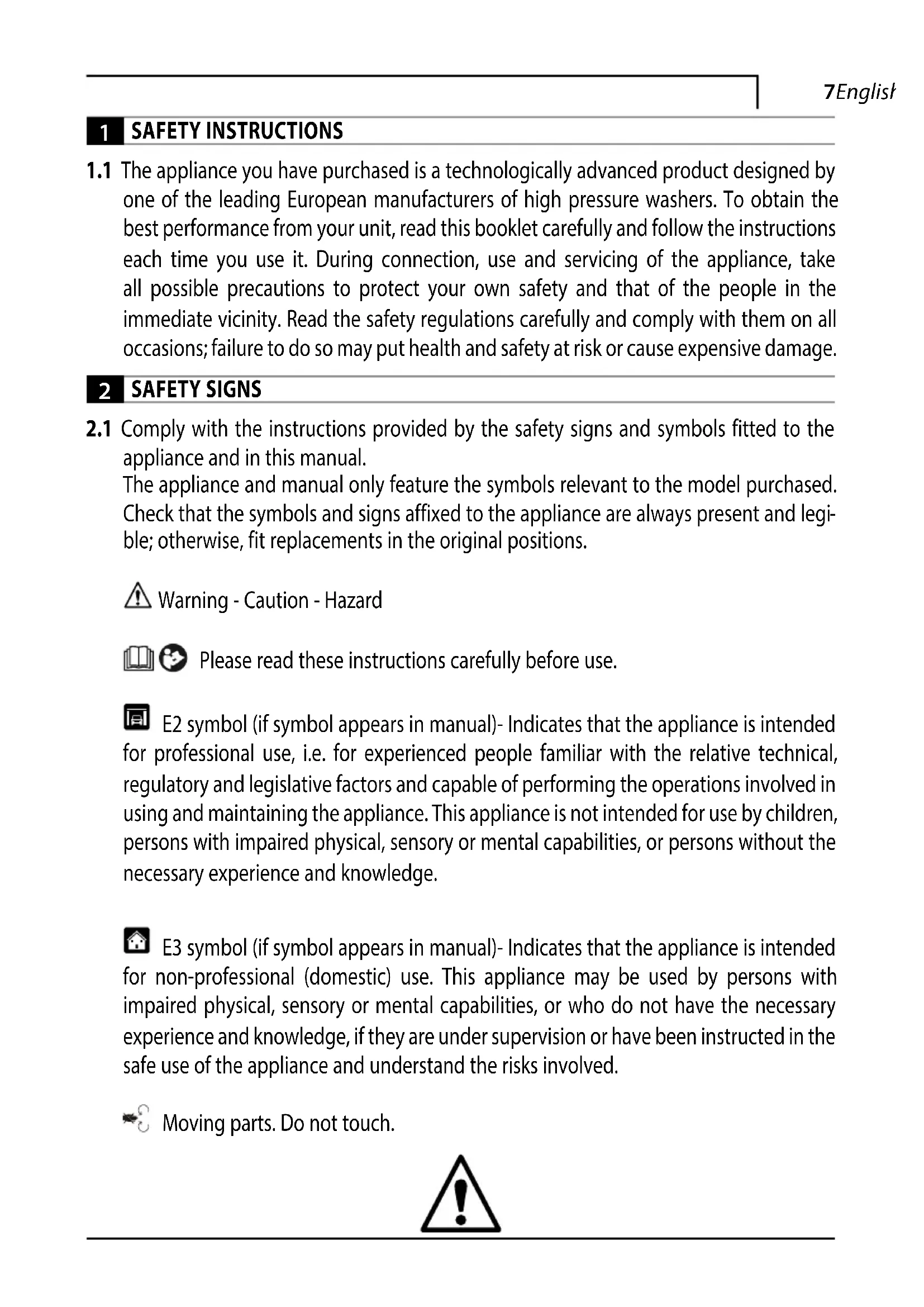 ble; otherwise, fit replacements in the original positions. Warning - Caution - Hazard Please read these instructions carefully before use. E2 symbol (if symbol appears in manual)- Indicates that the appliance is intended for professional use, i.e. for experienced people familiar with the relative technical, regulatory and legislative factors and capable of performing the operations involved in using and maintaining the appliance. This appliance is not intended for use by children, persons with impaired physical, sensory or mental capabilities, or persons without the necessary experience and knowledge. E3 symbol (if symbol appears in manual)- Indicates that the appliance is intended for non-professional (domestic) use. This appliance may be used by persons with impaired physical, sensory or mental capabilities, or who do not have the necessary experience and knowledge, if they are under supervision or have been instructed in the safe use of the appliance and understand the risks involved. Moving parts. Do not touch.8 English 0 Switch “OFF” position