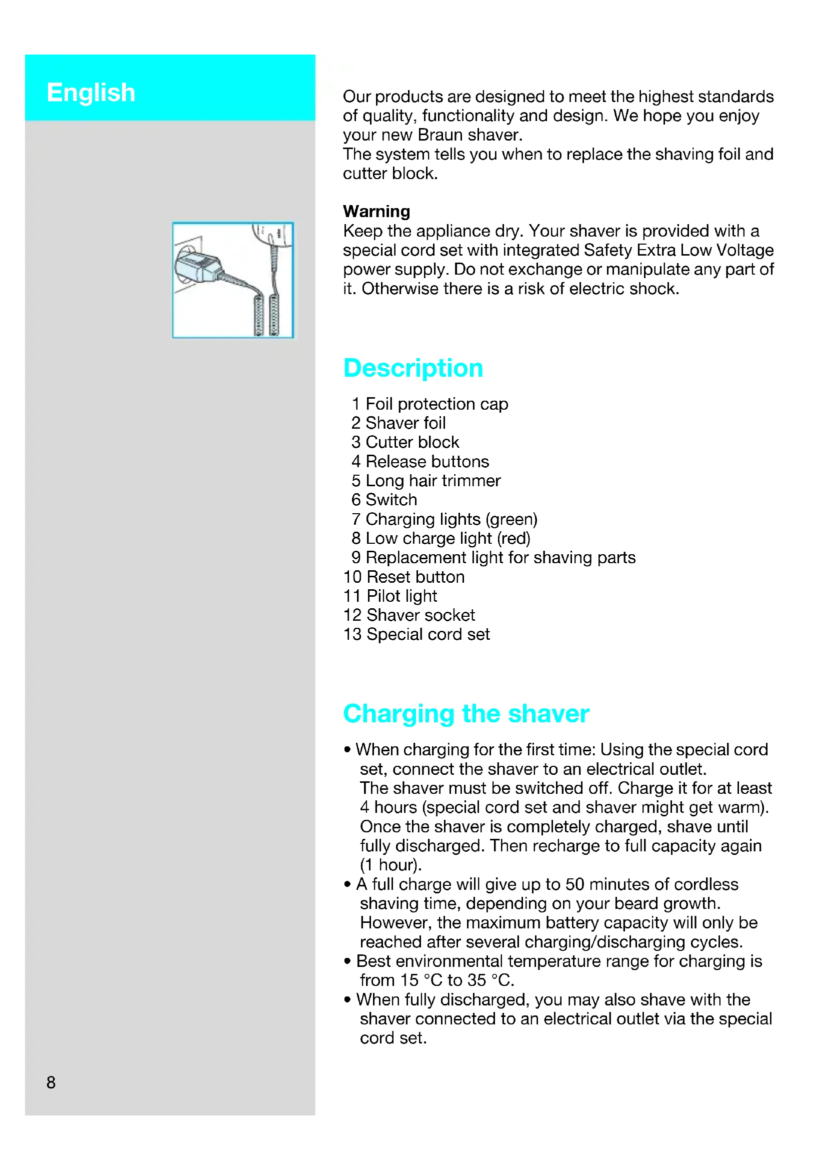 English 5647453_8975_70_S4-74 Seite 8 Dienstag, 7. März 2006 12:27 129 Indicator lights Pilot light (11): The shaver is connected to an electrical outlet. Model 8975: When the shaver is fully charged, all five charging lights (7) will light up (20% per light), provided the shaver is connected to an electrical outlet or switched on. Model 8970: The green single charging light (7) shows that the shaver is being charged. When fully charged, the charging light flashes or goes off. If later on, the charging light comes on again, this indicates that the shaver is being recharged to maintain its full capacity. The red low charge light (8) flashes when the battery capacity has dropped below 20%, provided the shaver is switched on. The remaining capacity will then be sufficient for 2 to 3 shaves. Shaving Switch positions off = (switch is locked) Press and push up the switch to operate the shaver: on = Shaving with the pivoting head (the pivoting cutting system automatically adjusts to every contour of your face). fix = Shaving with the pivoting head locked at an angle (to permit shaving in difficult areas, e.g. under the nose). trim= The long hair trimmer is activated (for trimming sideburns, moustache and beard).