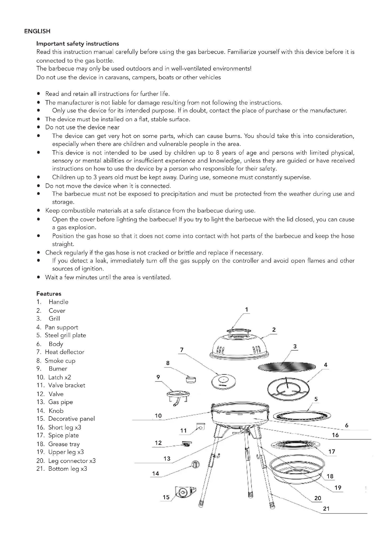1008 CT 3229NEDERLANDSENGLISH Important safety instructions Read this instruction manual carefully before using the gas barbecue. Familiarize yourself with this device before it is connected to the gas bottle. The barbecue may only be used outdoors and in well-ventilated environments! Do not use the device in caravans, campers, boats or other vehicles