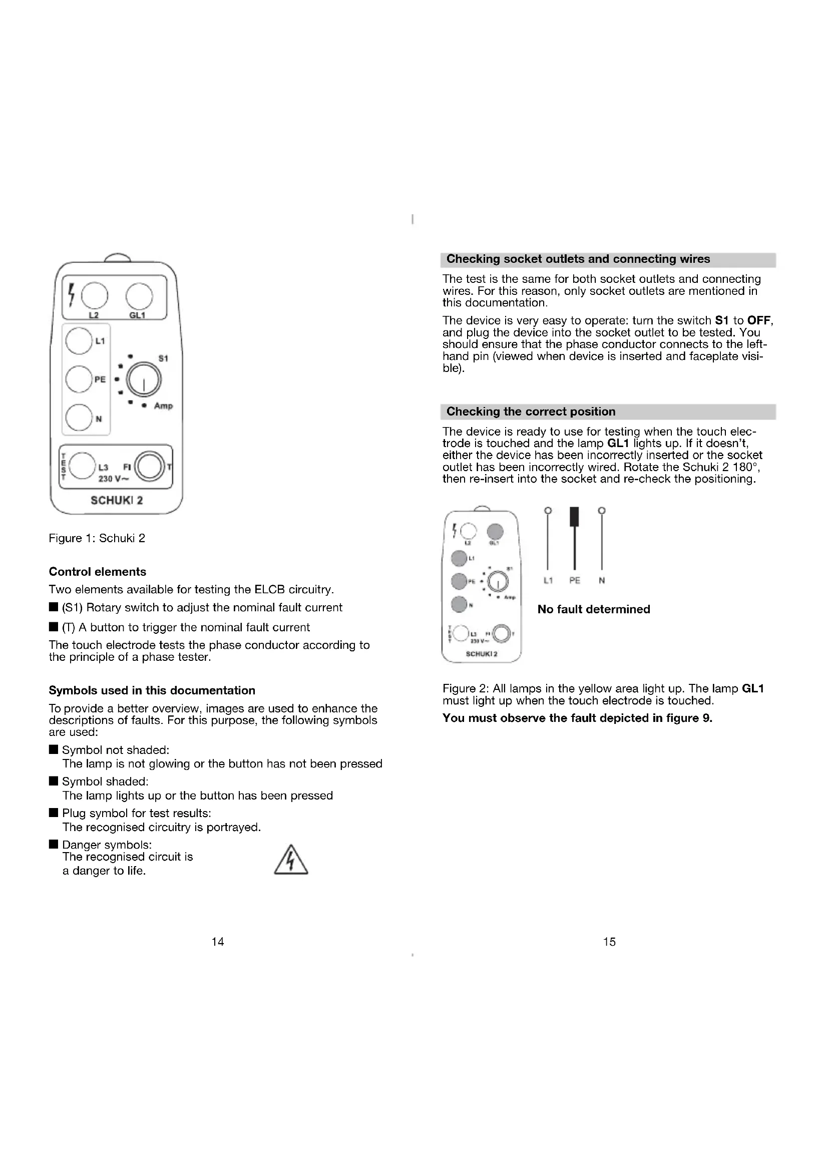 Figure 1: Schuki 2 Control elements Two elements available for testing the ELCB circuitry. y (S1) Rotary switch to adjust the nominal fault current y (T) A button to trigger the nominal fault current The touch electrode tests the phase conductor according to the principle of a phase tester. Symbols used in this documentation To provide a better overview, images are used to enhance the descriptions of faults. For this purpose, the following symbols are used: y Symbol not shaded: The lamp is not glowing or the button has not been pressed y Symbol shaded: The lamp lights up or the button has been pressed y Plug symbol for test results: The recognised circuitry is portrayed. y Danger symbols: The recognised circuit is a danger to life. Schuki 2 22.01.2004 15:49 Uhr Seite 1417 Figure 5: The lamps L1 and PE light up. Touching the touch electrode has no effect. The phase conductor is connected to the earthing contact! No neutral conductor, Phase and protective earth have been reversed. No protective earth Figure 6: The lamps L1 and N light up. GL1 lights up when the touch electrode is touched.