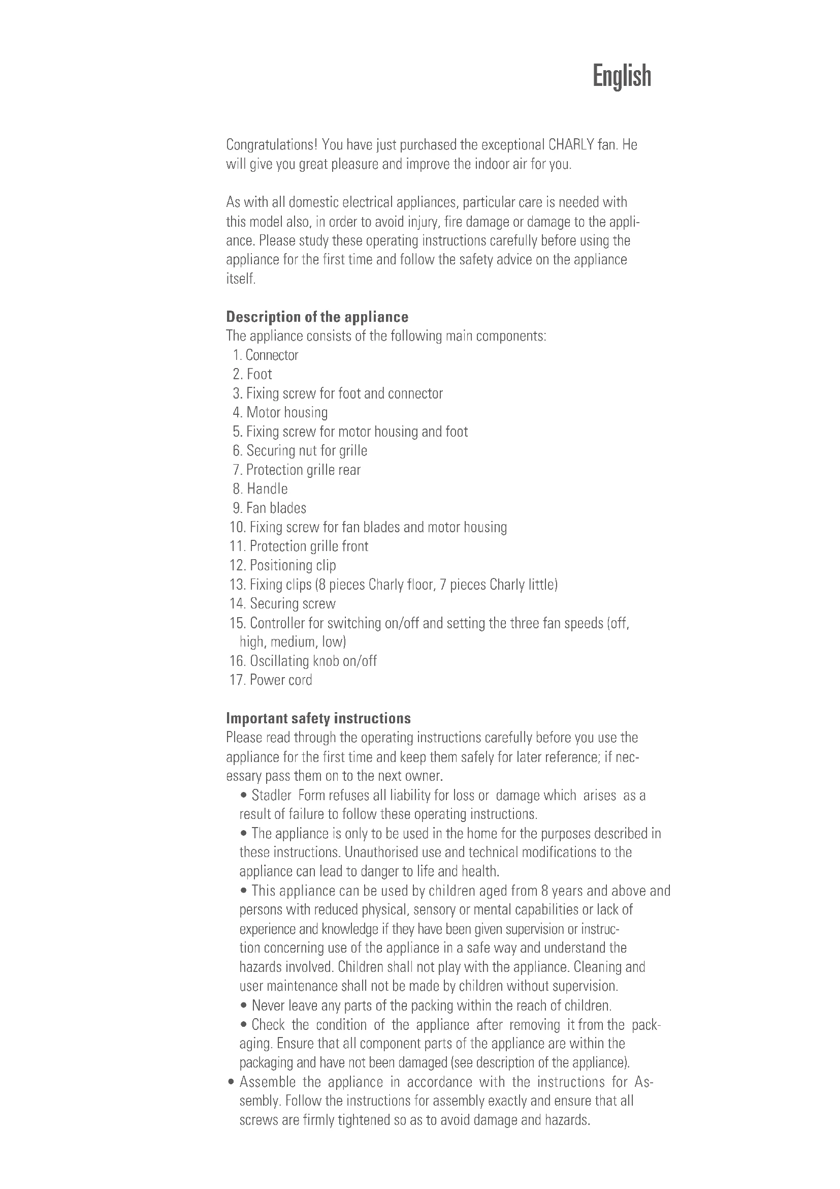 Download instruction manual: www.stadlerformusa.com/manualsCongratulations! You have just purchased the exceptional CHARLY fan. He will give you great pleasure and improve the indoor air for you. As with all domestic electrical appliances, particular care is needed with this model also, in order to avoid injury, fire damage or damage to the appli- ance. Please study these operating instructions carefully before using the appliance for the first time and follow the safety advice on the appliance itself. Description of the appliance The appliance consists of the following main components: