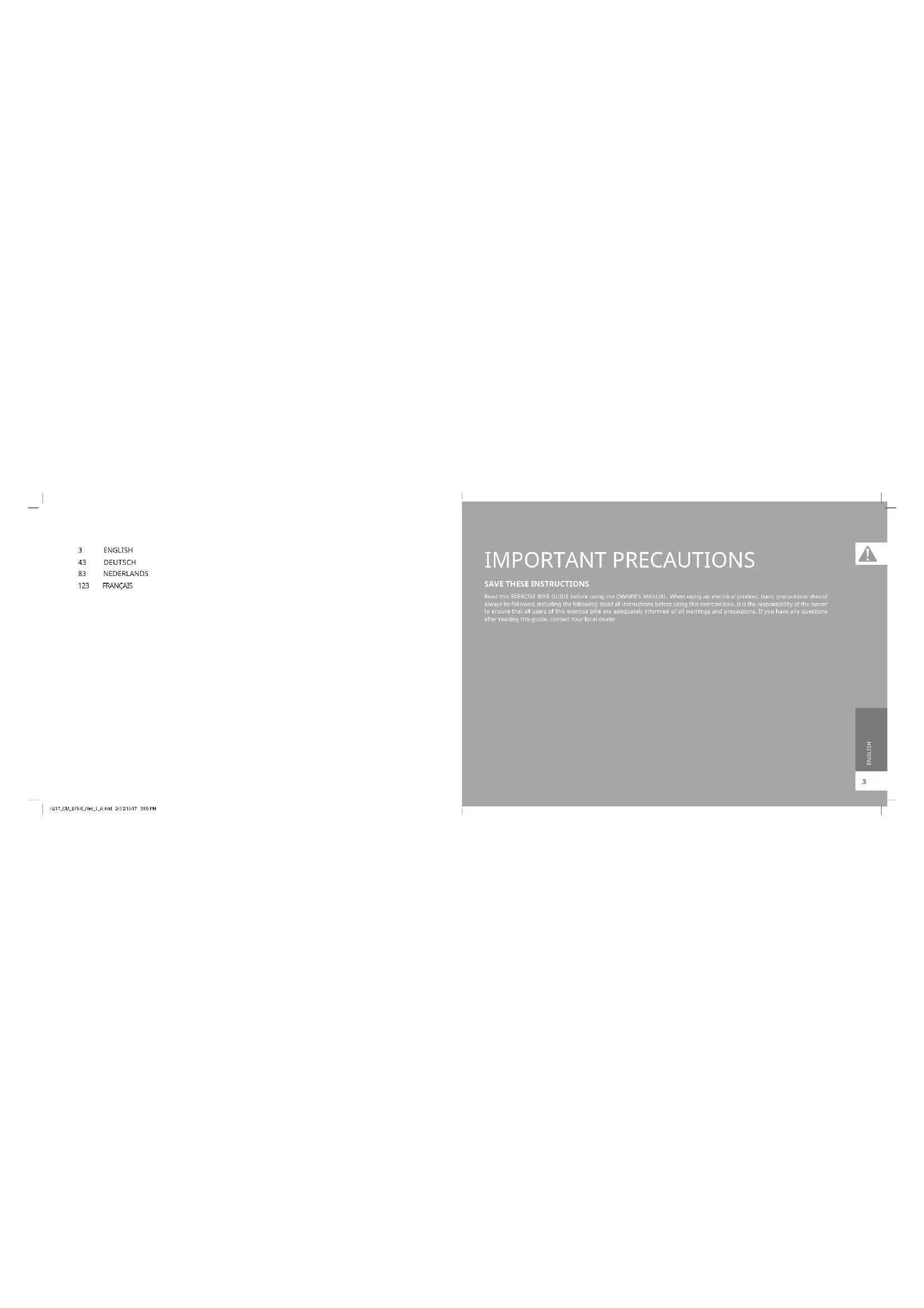 Read this EXERCISE BIKE GUIDE before using the OWNER’S MANUAL. When using an electrical product, basic precautions should always be followed, including the following: Read all instructions before using this exercise bike. It is the responsibility of the owner to ensure that all users of this exercise bike are adequately informed of all warnings and precautions. If you have any questions after reading this guide, contact Your local dealer. ENGLISH 3 ENGLISH 43 DEUTSCH 83 NEDERLANDS 123 FRANÇAIS HZ17_OM_BT5.0_Rev_1_A.indd 2-3 2/15/17 3:06 PM54 TO REDUCE THE RISK OF ELECTRICAL SHOCK: Always unplug the exercise bike from the electrical outlet immediately after using, before cleaning, performing maintenance and putting on or taking off parts. DANGER TO REDUCE THE RISK OF BURNS, FIRE, ELECTRICAL SHOCK OR INJURY TO PERSONS: