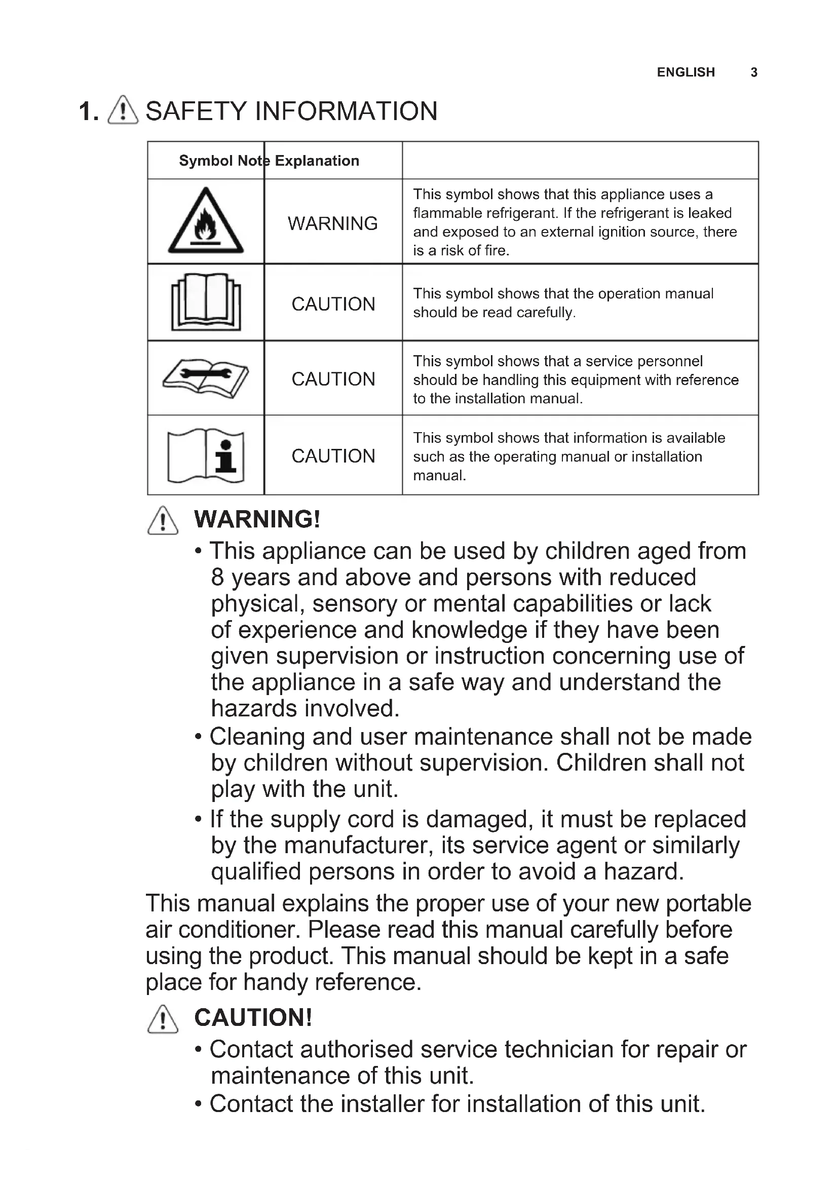- If the supply cord is damaged, it must be replaced by the manufacturer, its service agent or similarly qualifiedpersonsinordertoavoidahazard. This manual explains the proper use of your new portable air conditioner. Please read this manual carefully before using the product. This manual should be kept in a safe place for handy reference. CAUTION!