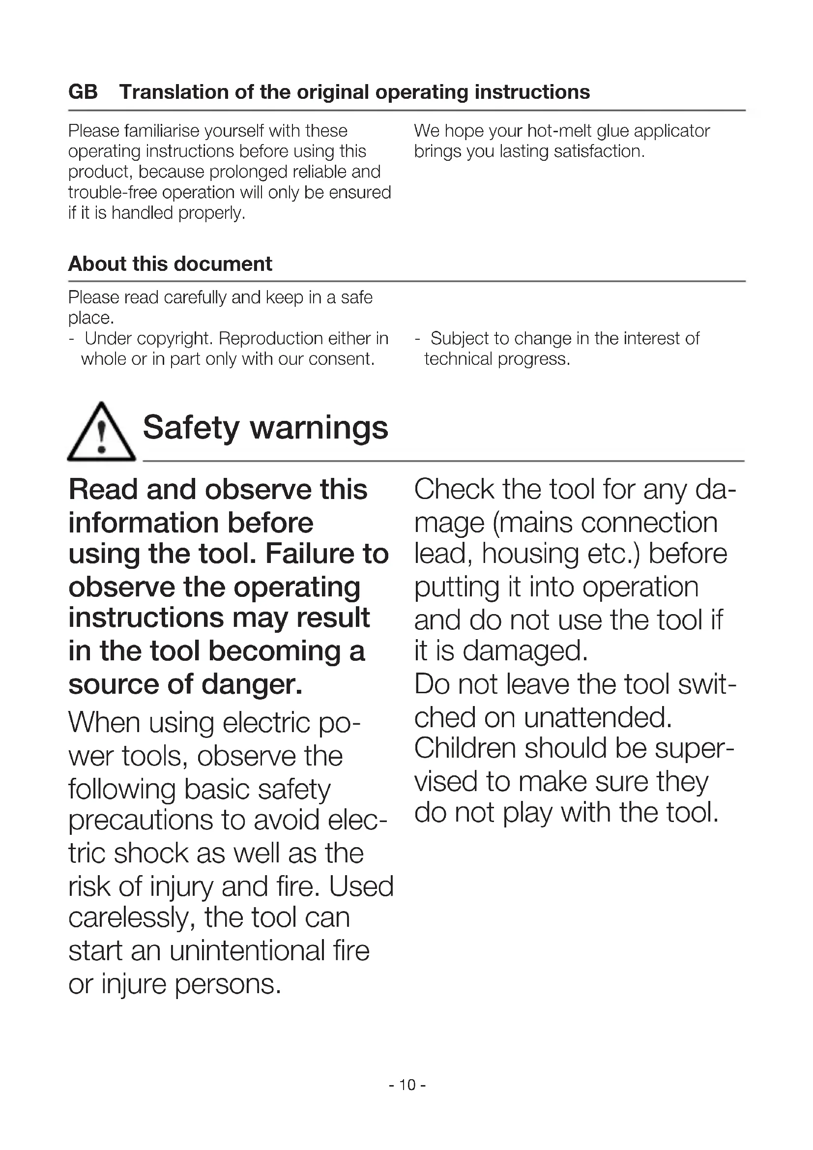 HERSTELLER GARANTIE HERSTELLER GARANTIE- 10 - Read and observe this information before using the tool. Failure to observe the operating instructions may result in the tool becoming a source of danger. When using electric po- wer tools, observe the following basic safety precautions to avoid elec- tric shock as well as the risk of injury and fire. Used carelessly, the tool can start an unintentional fire or injure persons. Check the tool for any da- mage (mains connection lead, housing etc.) before putting it into operation and do not use the tool if it is damaged. Do not leave the tool swit- ched on unattended. Children should be super- vised to make sure they do not play with the tool. Please familiarise yourself with these operating instructions before using this product, because prolonged reliable and trouble-free operation will only be ensured if it is handled properly. We hope your hot-melt glue applicator brings you lasting satisfaction. Translation of the original operating instructions About this document Please read carefully and keep in a safe place. - Under copyright. Reproduction either in whole or in part only with our consent. - Subject to change in the interest of technical progress. Safety warnings GB- 11 -