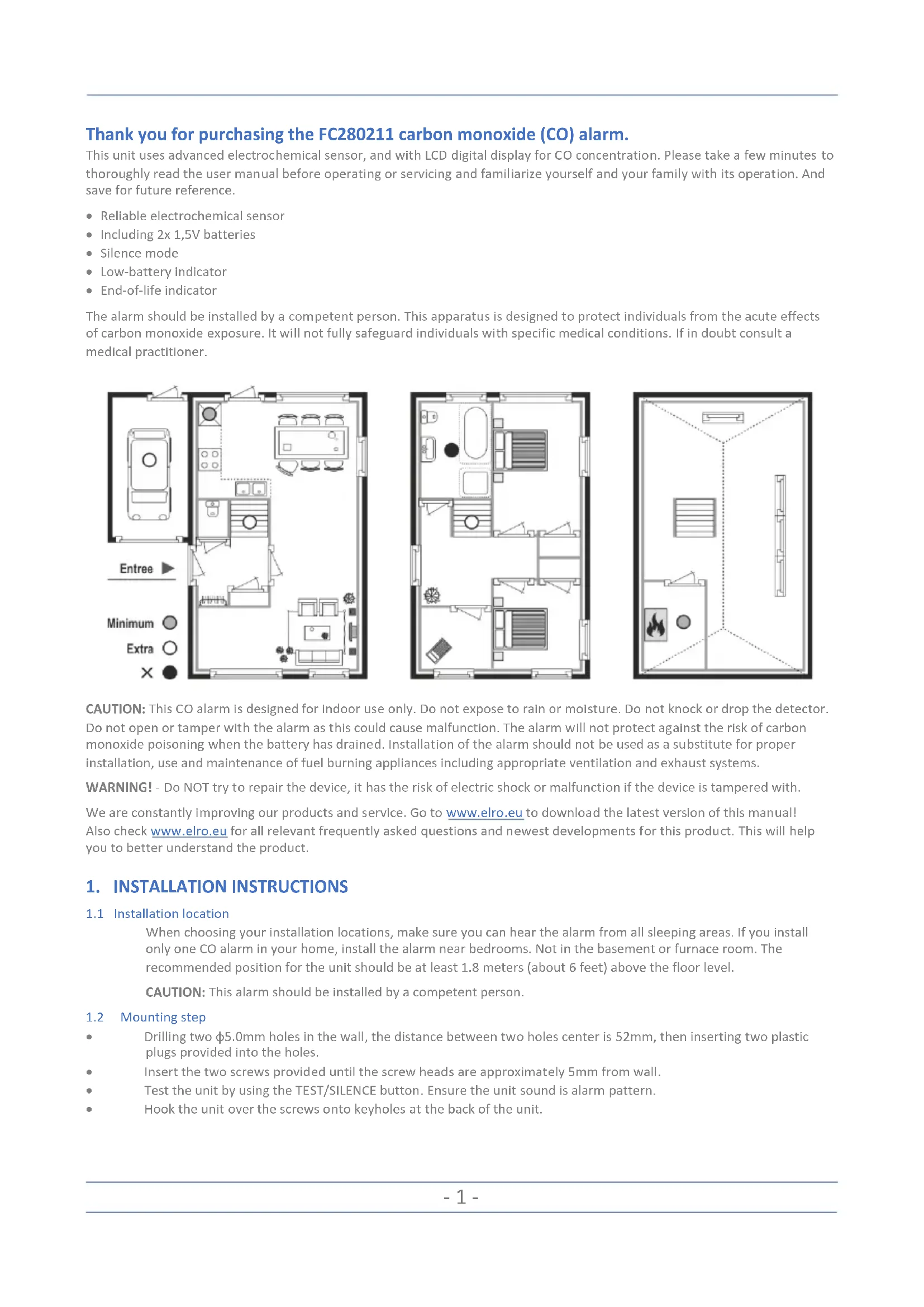 CAUTION: This CO alarm is designed for indoor use only. Do not expose to rain or moisture. Do not knock or drop the detector. Do not open or tamper with the alarm as this could cause malfunction. The alarm will not protect against the risk of carbon monoxide poisoning when the battery has drained. Installation of the alarm should not be used as a substitute for proper installation, use and maintenance of fuel burning appliances including appropriate ventilation and exhaust systems. WARNING! - Do NOT try to repair the device, it has the risk of electric shock or malfunction if the device is tampered with. We are constantly improving our products and service. Go to www.elro.eu to download the latest version of this manual! Also check www.elro.eu for all relevant frequently asked questions and newest developments for this product. This will help you to better understand the product.