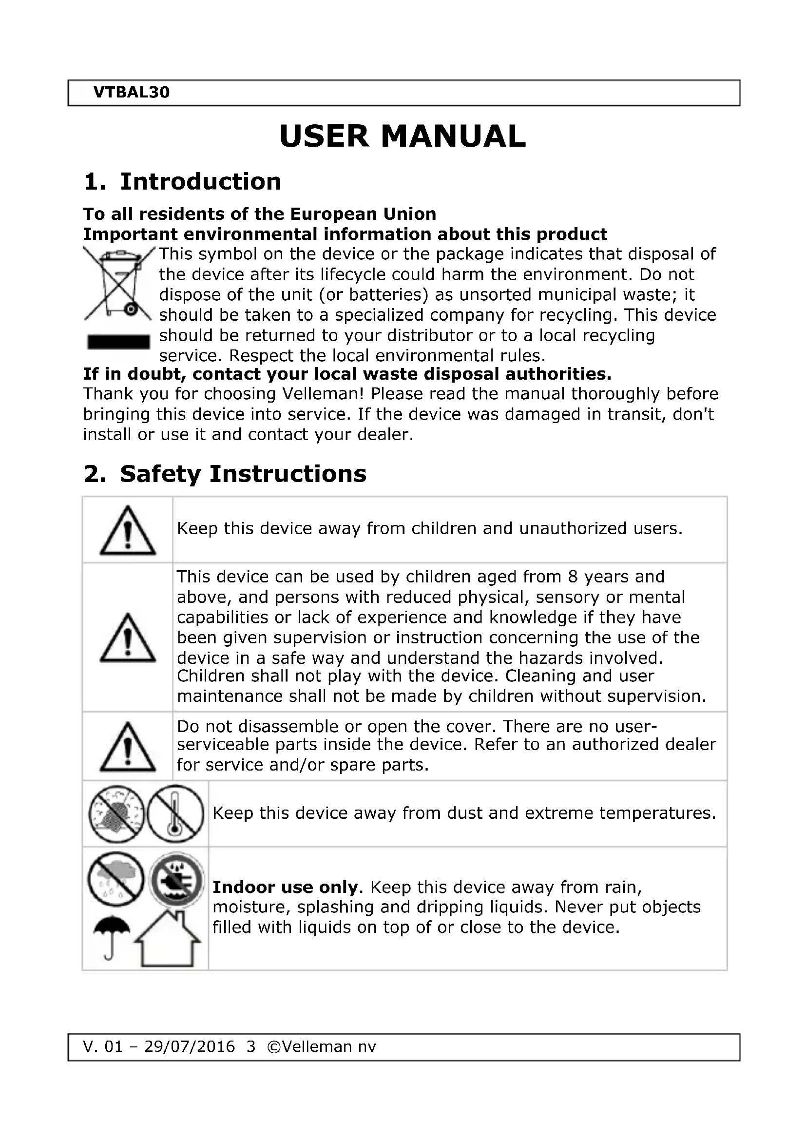 VTBAL30 - Measuring equipment VELLEMAN - Free user manual and instructions