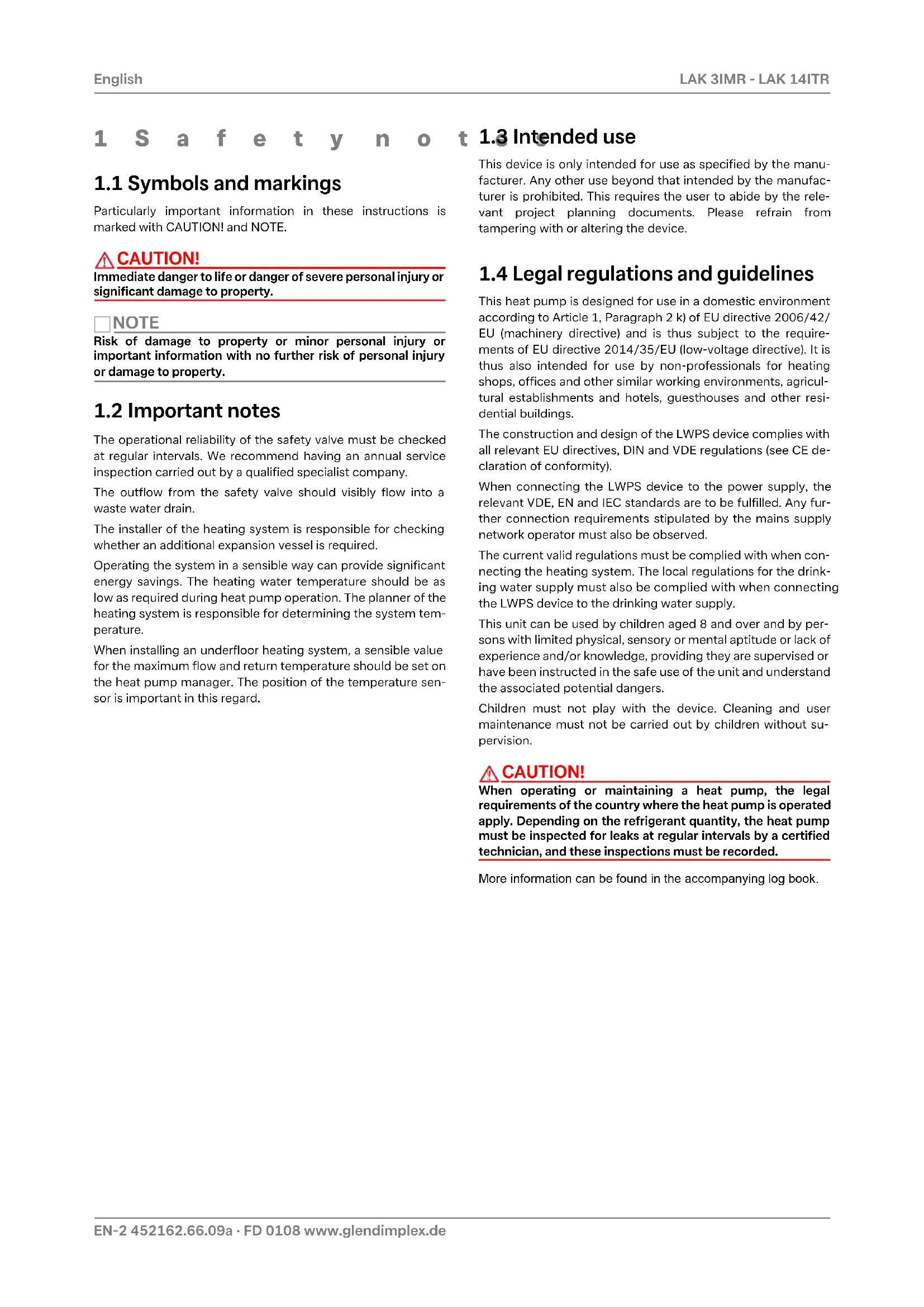 Equipped with a supplementary heater yes Model LAK 9IMR Air-to-water heat pump yes Water-to-water heat pump nowww.glendimplex.de 452162.66.09a · FD 0108 EN-23 LAK 3IMR - LAK 14ITR English Information requirements for heat pump space heaters and heat pump combination heaters