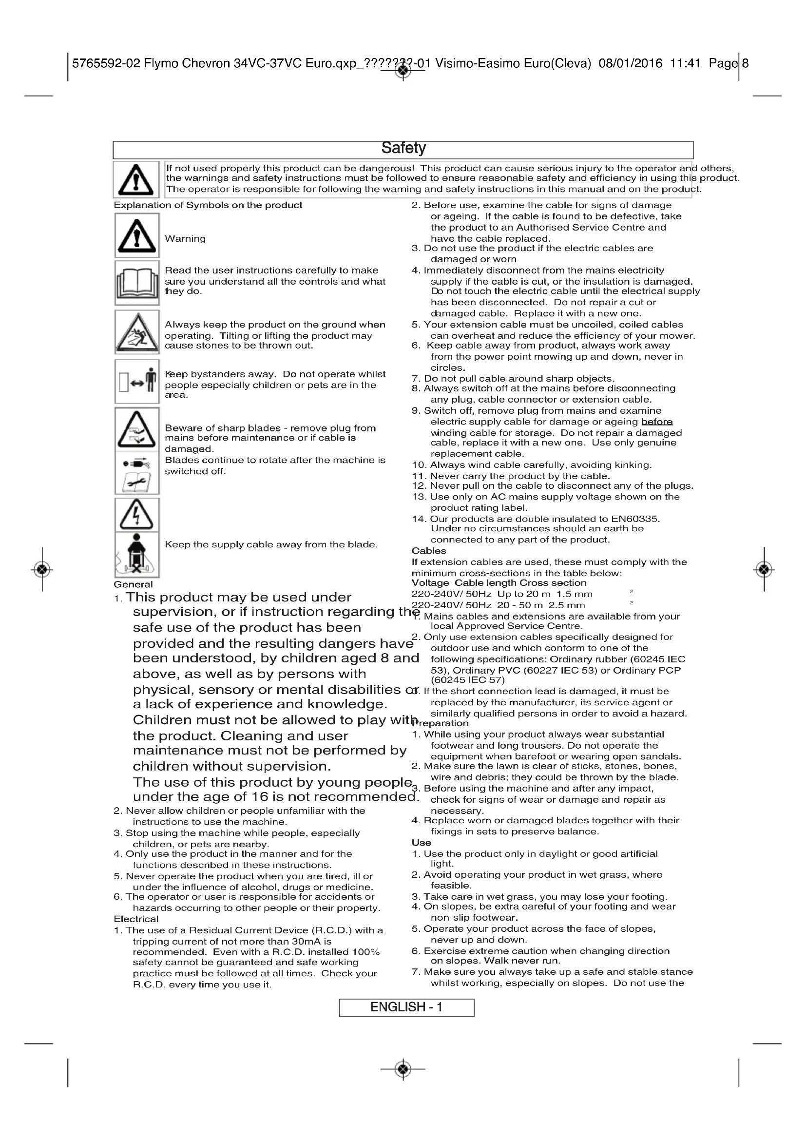 Για περαιτέρω συµβουλές ή επισκευές, επικοινωνήστε µε τον τοπικό σας αντιπρόσωπο. 5765592-02 Flymo Chevron 34VC-37VC Euro.qxp_???????-01 Visimo-Easimo Euro(Cleva) 08/01/2016 11:41 Page 7Safety If not used properly this product can be dangerous! This product can cause serious injury to the operator and others, the warnings and safety instructions must be followed to ensure reasonable safety and efficiency in using this product. The operator is responsible for following the warning and safety instructions in this manual and on the product. Explanation of Symbols on the product Warning Read the user instructions carefully to make