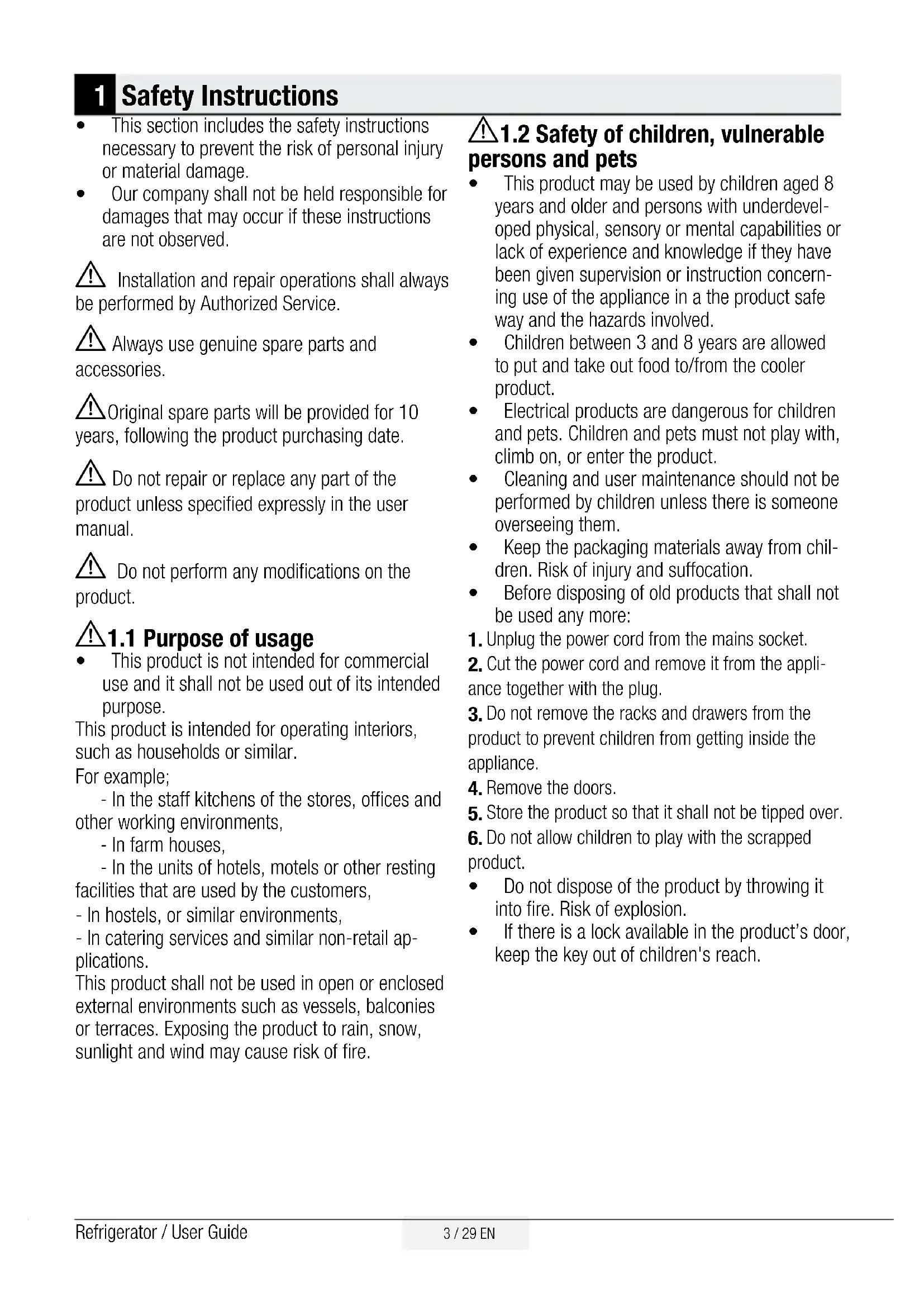 7 Maintenance and cleaning 27 8 Troubleshooting 283 / 29 EN Refrigerator / User Guide 1 Safety Instructions t This section includes the safety instructions necessary to prevent the risk of personal injury or material damage. t Our company shall not be held responsible for damages that may occur if these instructions are not observed. A Installation and repair operations shall always be performed by Authorized Service. A Always use genuine spare parts and accessories. AOriginal spare parts will be provided for 10 years, following the product purchasing date. A Do not repair or replace any part of the product unless specified expressly in the user manual. A Do not perform any modifications on the product. A1.1 Purpose of usage t This product is not intended for commercial use and it shall not be used out of its intended purpose. This product is intended for operating interiors, such as households or similar. For example; - In the staff kitchens of the stores, offices and other working environments, - In farm houses, - In the units of hotels, motels or other resting facilities that are used by the customers, - In hostels, or similar environments, - In catering services and similar non-retail ap- plications. This product shall not be used in open or enclosed external environments such as vessels, balconies or terraces. Exposing the product to rain, snow, sunlight and wind may cause risk of fire. A1.2 Safety of children, vulnerable persons and pets t This product may be used by children aged 8 years and older and persons with underdevel- oped physical, sensory or mental capabilities or lack of experience and knowledge if they have been given supervision or instruction concern- ing use of the appliance in a the product safe way and the hazards involved. t Children between 3 and 8 years are allowed to put and take out food to/from the cooler product. t Electrical products are dangerous for children and pets. Children and pets must not play with, climb on, or enter the product. t Cleaning and user maintenance should not be performed by children unless there is someone overseeing them. t Keep the packaging materials away from chil- dren. Risk of injury and suffocation. t Before disposing of old products that shall not be used any more: