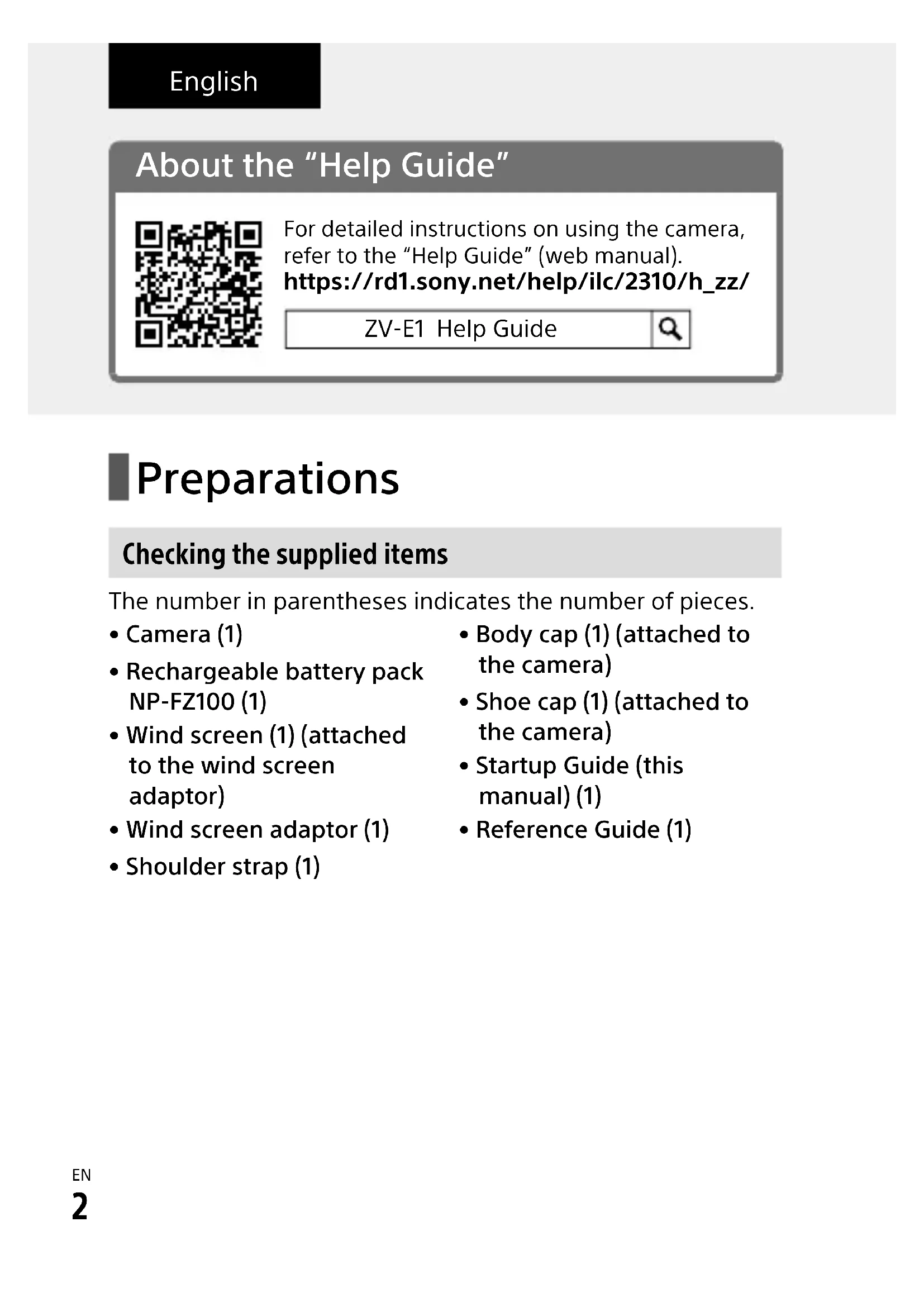 About the “Help Guide” For detailed instructions on using the camera, refer to the “Help Guide” (web manual).https://rd1.sony.net/help/ilc/2310/h_zz/ZV-E1 Help Guide English Preparations Checking the supplied items The number in parentheses indicates the number of pieces.• Camera (1)• Rechargeable battery pack NP-FZ100 (1)• Wind screen (1) (attached to the wind screen adaptor)• Wind screen adaptor (1)• Shoulder strap (1)• Body cap (1) (attached to the camera)• Shoe cap (1) (attached to the camera)• Startup Guide (this manual) (1)• Reference Guide (1)EN