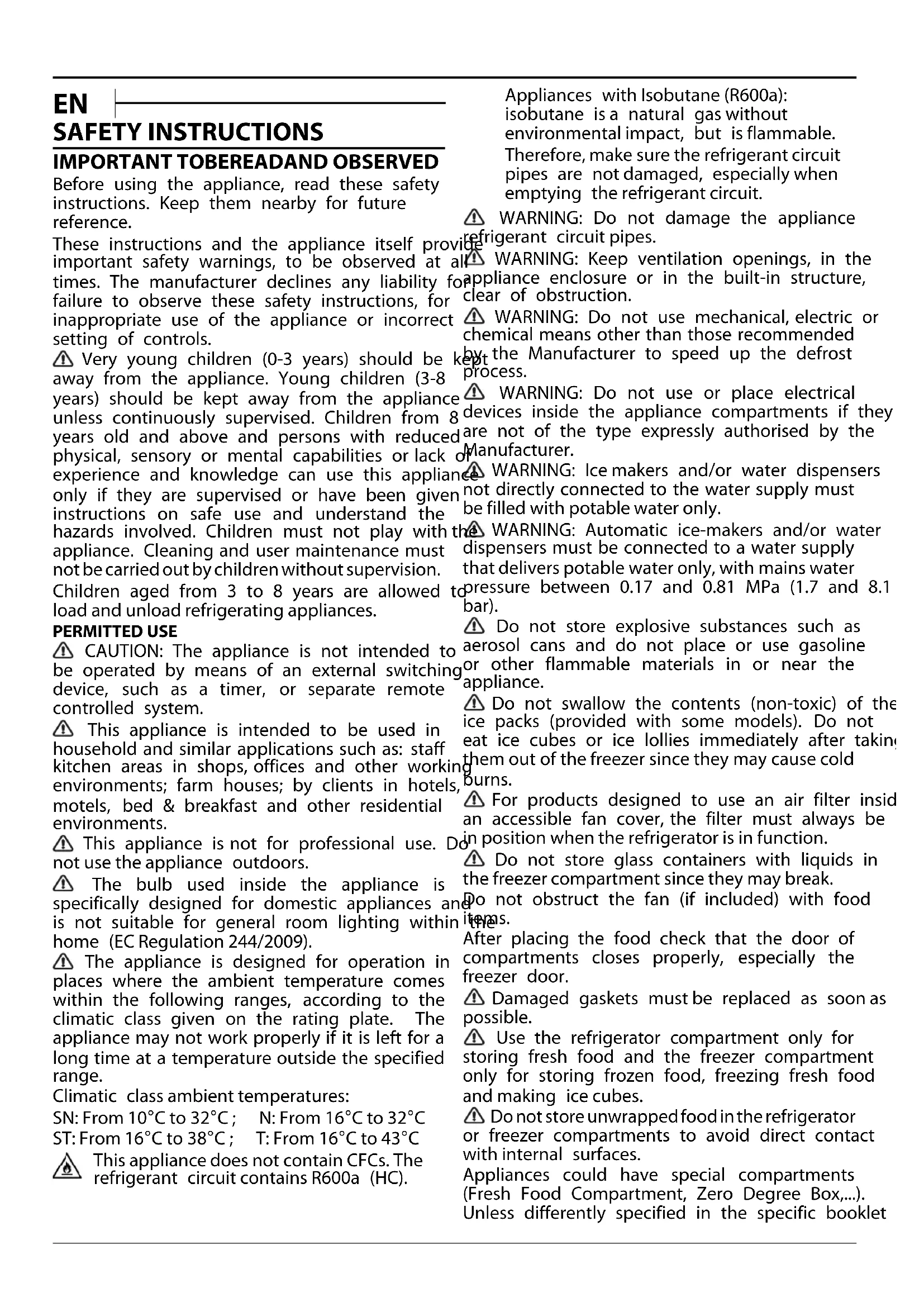 Before using the appliance, read these safety instructions. Keep them nearby for future reference. These instructions and the appliance itself provide important safety warnings, to be observed at all times. The manufacturer declines any liability for failure to observe these safety instructions, for inappropriate use of the appliance or incorrect setting of controls. Very young children (0-3 years) should be kept away from the appliance. Young children (3-8 years) should be kept away from the appliance unless continuously supervised. Children from 8 years old and above and persons with reduced physical, sensory or mental capabilities or lack of experience and knowledge can use this appliance only if they are supervised or have been given instructions on safe use and understand the hazards involved. Children must not play with the appliance. Cleaning and user maintenance must notbecarriedoutbychildrenwithoutsupervision. Children aged from 3 to 8 years are allowed to load and unload refrigerating appliances. PERMITTED USE CAUTION: The appliance is not intended to be operated by means of an external switching device, such as a timer, or separate remote controlled system. This appliance is intended to be used in household and similar applications such as: staff kitchen areas in shops, offices and other working environments; farm houses; by clients in hotels, motels, bed & breakfast and other residential environments. This appliance is not for professional use. Do not use the appliance outdoors. The bulb used inside the appliance is specifically designed for domestic appliances and is not suitable for general room lighting within the home (EC Regulation 244/2009). The appliance is designed for operation in places where the ambient temperature comes within the following ranges, according to the climatic class given on the rating plate. The appliance may not work properly if it is left for a long time at a temperature outside the specified range. Climatic class ambient temperatures: SN: From 10°C to 32°C ; N: From 16°C to 32°C ST: From 16°C to 38°C ; T: From 16°C to 43°C This appliance does not contain CFCs. The refrigerant circuit contains R600a (HC). Appliances with Isobutane (R600a): isobutane is a natural gas without environmental impact, but is flammable. Therefore, make sure the refrigerant circuit pipes are not damaged, especially when emptying the refrigerant circuit.
