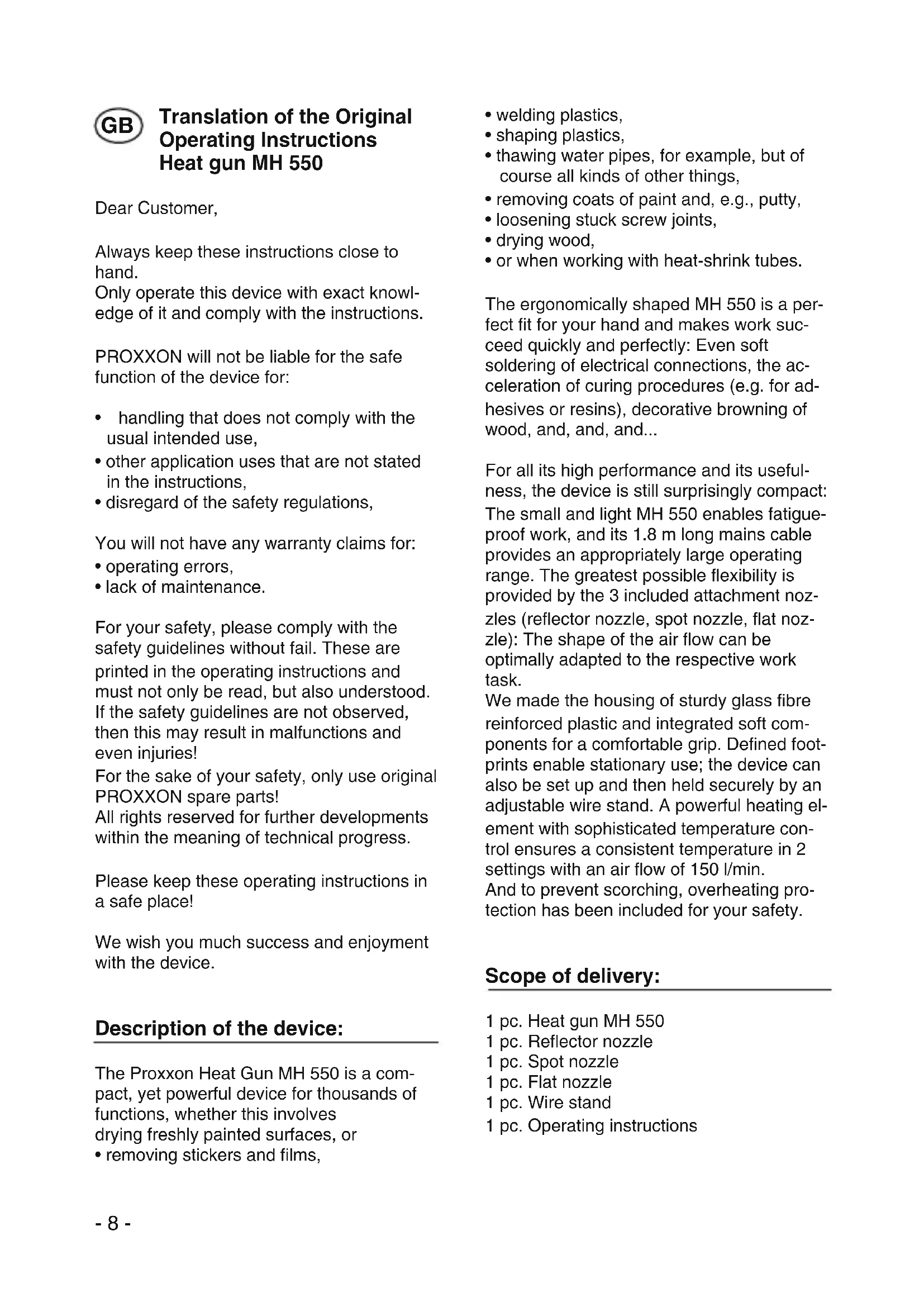 - lack of maintenance. For your safety, please comply with the safety guidelines without fail. These are printed in the operating instructions and must not only be read, but also understood. If the safety guidelines are not observed, then this may result in malfunctions and even injuries! For the sake of your safety, only use original PROXXON spare parts! All rights reserved for further developments within the meaning of technical progress. Please keep these operating instructions in a safe place! We wish you much success and enjoyment with the device. Description of the device: The Proxxon Heat Gun MH 550 is a com- pact, yet powerful device for thousands of functions, whether this involves drying freshly painted surfaces, or