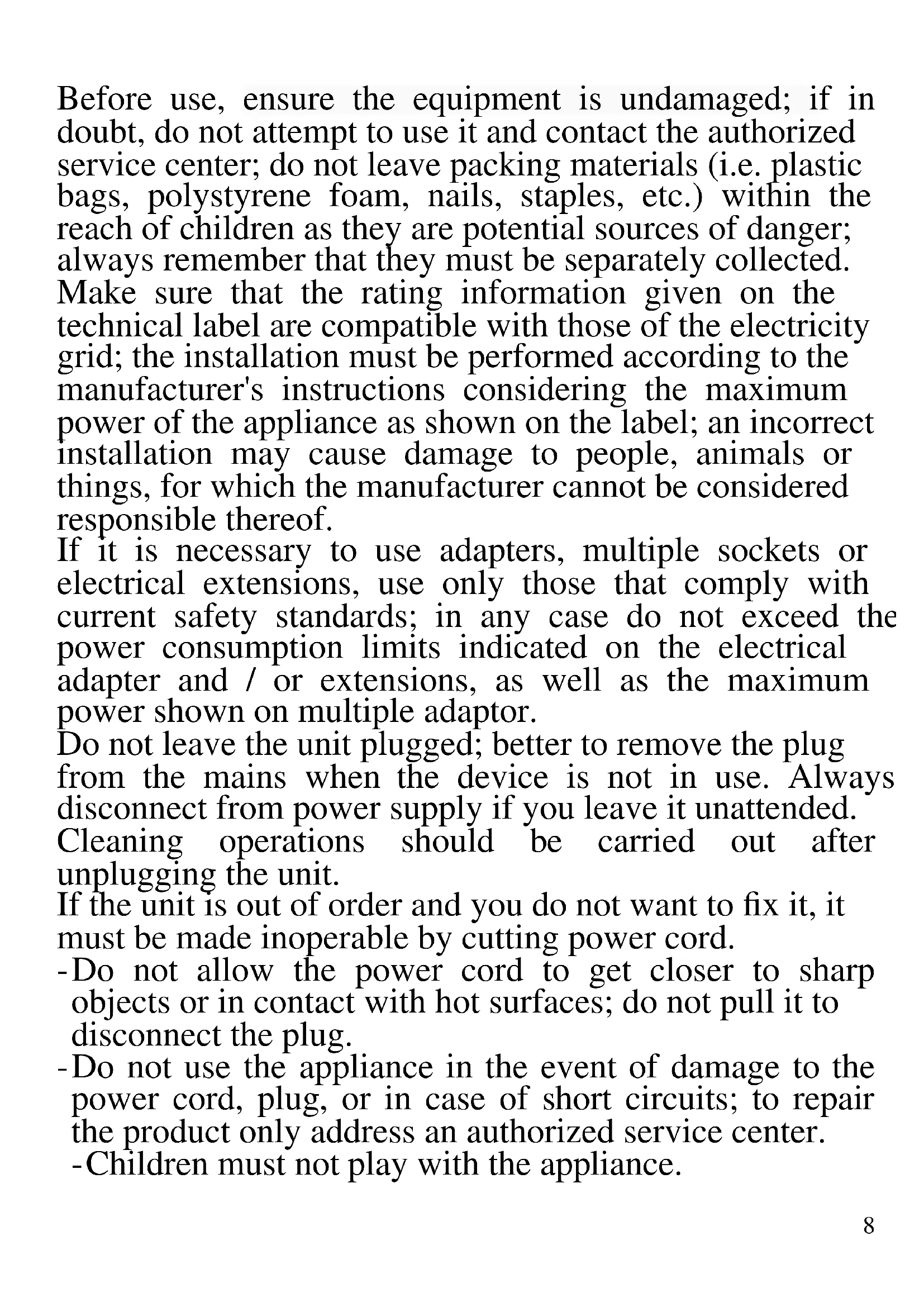 The following are important notes on the installation, use and maintenance; save this instruction manual for future reference; use the equipment only as specified in this guide; any other use is considered improper and dangerous; therefore, the manufacturer cannot be held responsible in the event of damages caused by improper, incorrect or unreasonable use. PH028 Before use, ensure the equipment is undamaged; if in doubt, do not attempt to use it and contact the authorized service center; do not leave packing materials (i.e. plastic bags, polystyrene foam, nails, staples, etc.) within the reach of children as they are potential sources of danger; always remember that they must be separately collected. Make sure that the rating information given on the technical label are compatible with those of the electricity grid; the installation must be performed according to the manufacturer's instructions considering the maximum power of the appliance as shown on the label; an incorrect installation may cause damage to people, animals or things, for which the manufacturer cannot be considered responsible thereof. If it is necessary to use adapters, multiple sockets or electrical extensions, use only those that comply with current safety standards; in any case do not exceed the power consumption limits indicated on the electrical adapter and / or extensions, as well as the maximum power shown on multiple adaptor. Do not leave the unit plugged; better to remove the plug from the mains when the device is not in use. Always disconnect from power supply if you leave it unattended. Cleaning operations should be carried out after unplugging the unit. If the unit is out of order and you do not want to fix it, it must be made inoperable by cutting power cord. - Do not allow the power cord to get closer to sharp objects or in contact with hot surfaces; do not pull it to disconnect the plug. - Do not use the appliance in the event of damage to the power cord, plug, or in case of short circuits; to repair the product only address an authorized service center. - Children must not play with the appliance.9 - Do not handle or touch the appliance with wet hands or bare feet. Do not expose the appliance to harmful weather conditions such as rain, moisture, frost, etc.. Always store it in a dry place. - This appliance can be used by children of 8 years and above and persons with reduced physical, sensory or mental capabilities or lack of experience and knowledge if they received supervision or instruction concerning use of the appliance in a safe way and understand hazards involved; children shall not play with the appliance; cleaning and user maintenance shall not be made by children without supervision. - Keep the appliance and its cord out of reach of children less than 8 years. If the power cord is damaged, or in case of failure and / or malfunction do not tamper with the unit. The reparation must be done by manufacturer or by service center authorized by the manufacturer in order to prevent any risk. Failure to comply with the above may compromise the unit safety and invalidate the warranty.