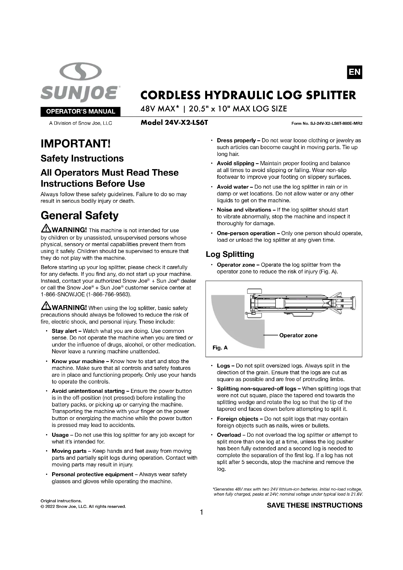 Original instructions.© 2022 Snow Joe, LLC. All rights reserved. A Division of Snow Joe, LLC Model 24V-X2-LS6T Form No. SJ-24V-X2-LS6T-880E-MR2