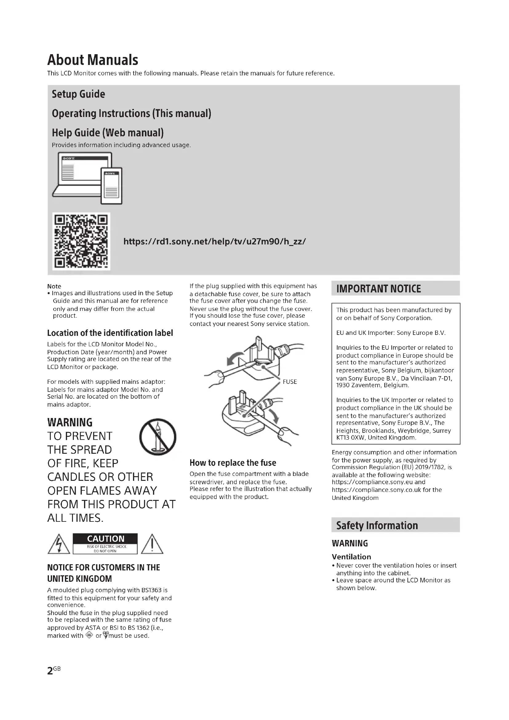 UNITED KINGDOM A moulded plug complying with BS1363 is fitted to this equipment for your safety and convenience.Should the fuse in the plug supplied need to be replaced with the same rating of fuse approved by ASTA or BSI to BS 1362 (i.e., marked with or ) must be used.If the plug supplied with this equipment has a detachable fuse cover, be sure to attach the fuse cover after you change the fuse. Never use the plug without the fuse cover. If you should lose the fuse cover, please contact your nearest Sony service station. FUSE How to replace the fuse Open the fuse compartment with a blade screwdriver, and replace the fuse.Please refer to the illustration that actually equipped with the product. IMPORTANT NOTICE This product has been manufactured by or on behalf of Sony Corporation.EU and UK Importer: Sony Europe B.V.Inquiries to the EU Importer or related to product compliance in Europe should be sent to the manufacturer’s authorized representative, Sony Belgium, bijkantoor van Sony Europe B.V., Da Vincilaan 7-D1, 1930 Zaventem, Belgium.Inquiries to the UK Importer or related to product compliance in the UK should be sent to the manufacturer’s authorized representative, Sony Europe B.V., The Heights, Brooklands, Weybridge, Surrey KT13 0XW, United Kingdom.Energy consumption and other information for the power supply, as required by Commission Regulation (EU) 2019/1782, is available at the following website: https://compliance.sony.eu and https://compliance.sony.co.uk for the United Kingdom Safety Information WARNING Ventilation•Never cover the ventilation holes or insert anything into the cabinet.•Leave space around the LCD Monitor as shown below. About Manuals This LCD Monitor comes with the following manuals. Please retain the manuals for future reference. Setup Guide Operating Instructions (This manual) Help Guide (Web manual) Provides information including advanced usage.https://rd1.sony.net/help/tv/u27m90/h_zz/SDM-U27M90 5-042-069-31(2)