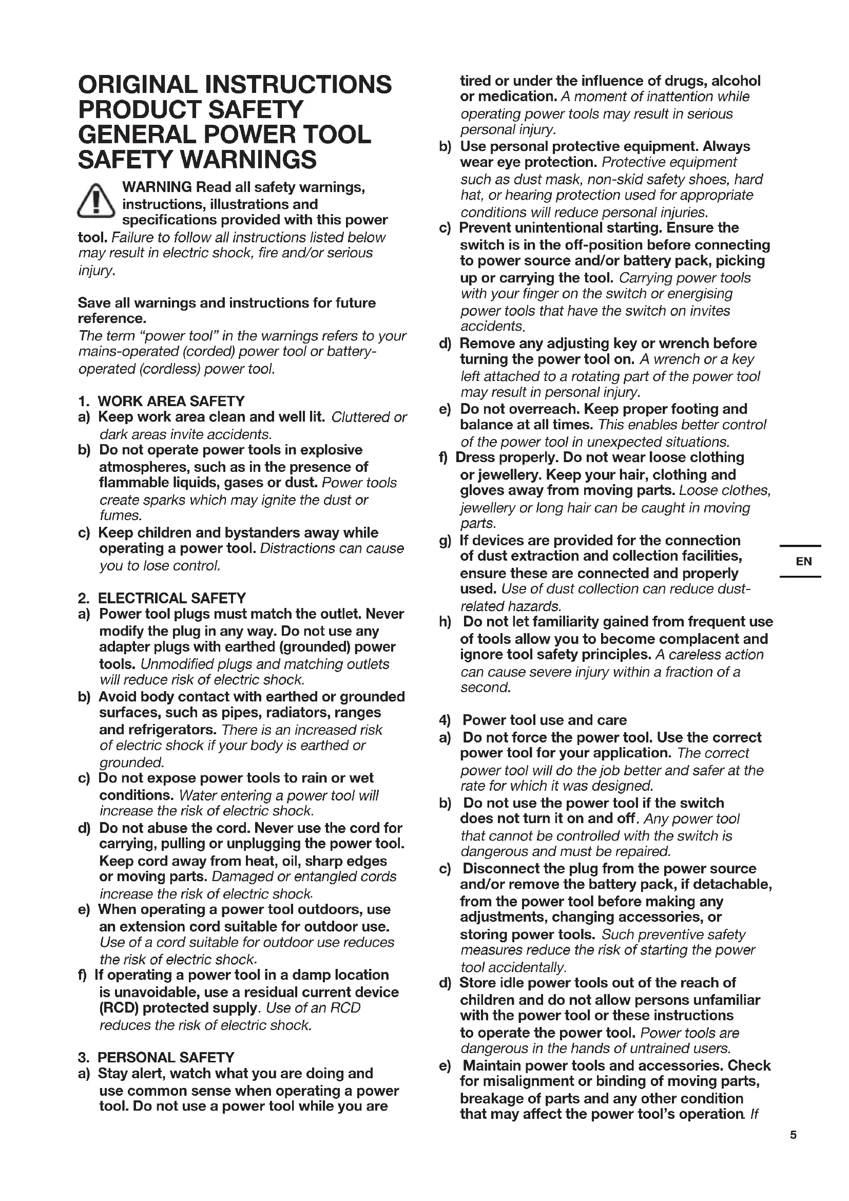 f) If operating a power tool in a damp location is unavoidable, use a residual current device (RCD) protected supply . Use of an RCD reduces the risk of electric shock.