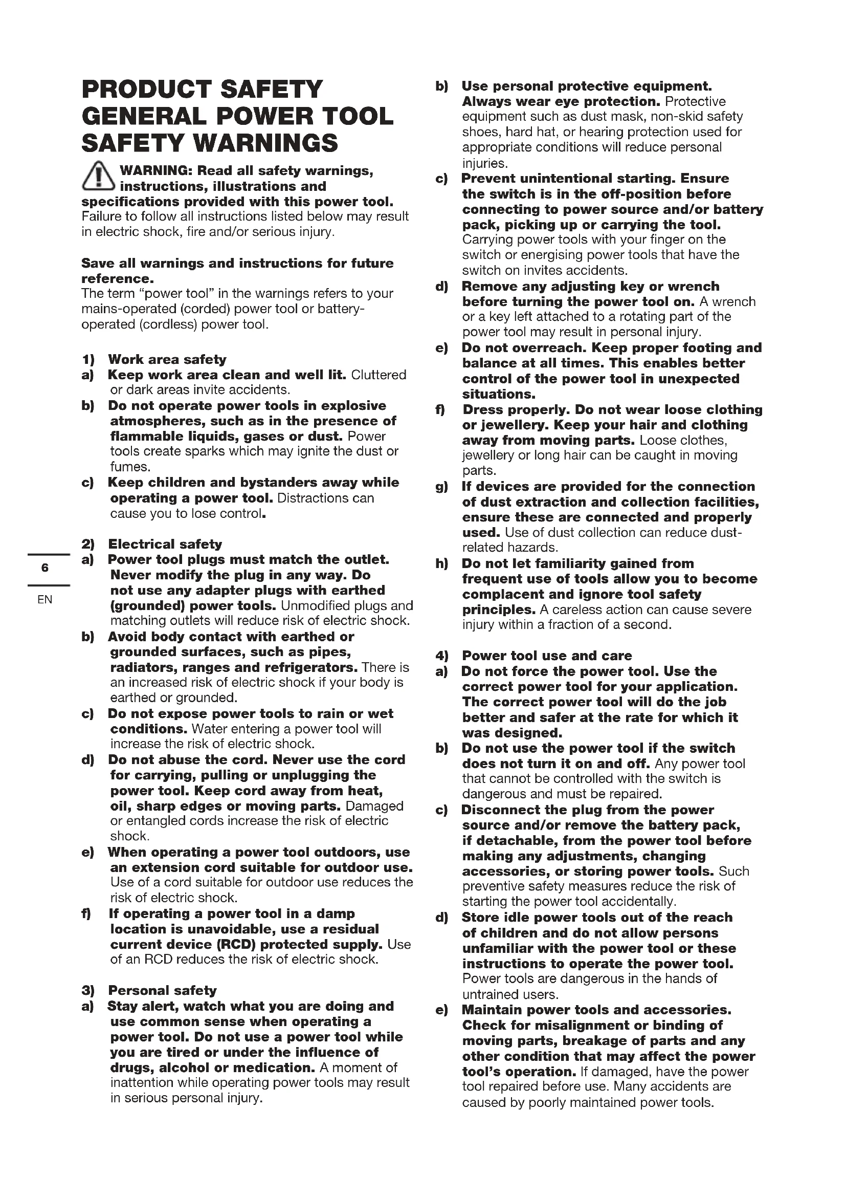 a) Do not force the power tool. Use the correct power tool for your application. The correct power tool will do the job better and safer at the rate for which it was designed. b) Do not use the power tool if the switch does not turn it on and off. Any power tool that cannot be controlled with the switch is dangerous and must be repaired. c) Disconnect the plug from the power source and/or remove the battery pack, if detachable, from the power tool before making any adjustments, changing accessories, or storing power tools. Such preventive safety measures reduce the risk of starting the power tool accidentally. d) Store idle power tools out of the reach of children and do not allow persons unfamiliar with the power tool or these instructions to operate the power tool. Power tools are dangerous in the hands of untrained users. e) Maintain power tools and accessories. Check for misalignment or binding of moving parts, breakage of parts and any other condition that may affect the power tool’s operation. If damaged, have the power tool repaired before use. Many accidents are caused by poorly maintained power tools.7