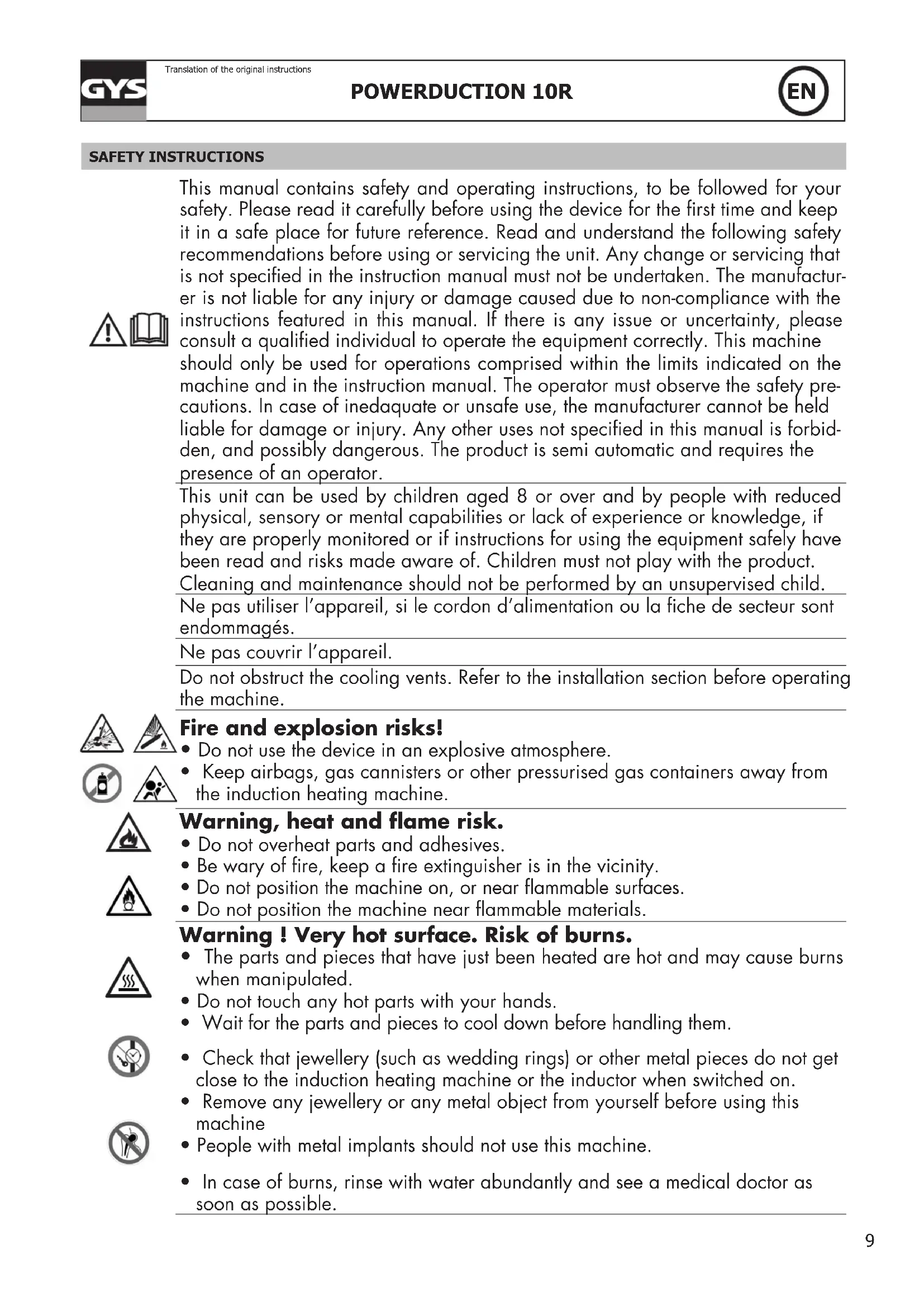 - Keep airbags, gas cannisters or other pressurised gas containers away from the induction heating machine. Warning, heat and ame risk.