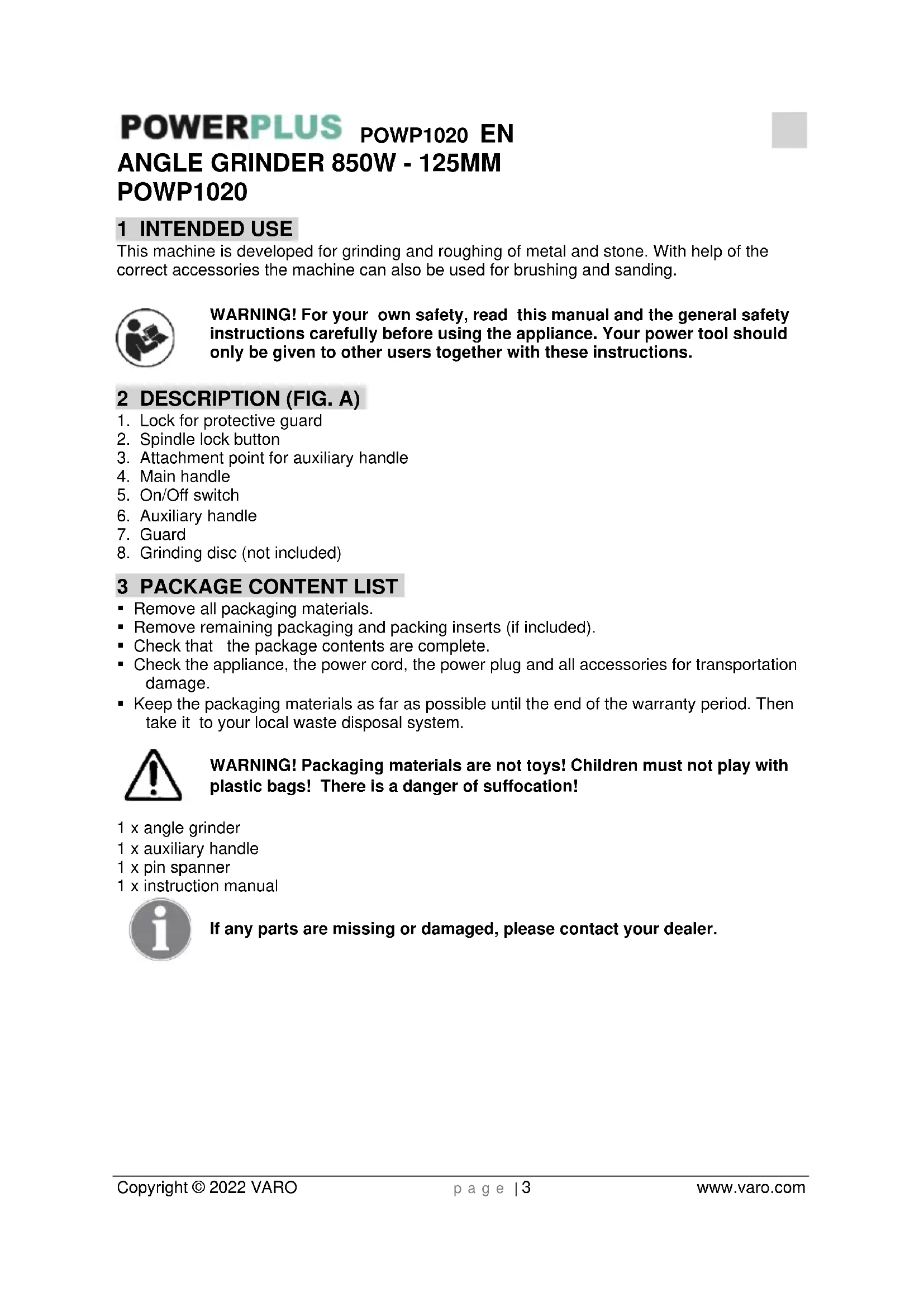 - Keep the packaging materials as far as possible until the end of the warranty period. Then take it to your local waste disposal system. WARNING! Packaging materials are not toys! Children must not play with plastic bags! There is a danger of suffocation! 1 x angle grinder 1 x auxiliary handle 1 x pin spanner 1 x instruction manual If any parts are missing or damaged, please contact your dealer.POWP1020 EN Copyright © 2022 VARO p a g e | 4 www.varo.com 4 SYMBOLS In this manual and/or on the machine the following symbols are used:
