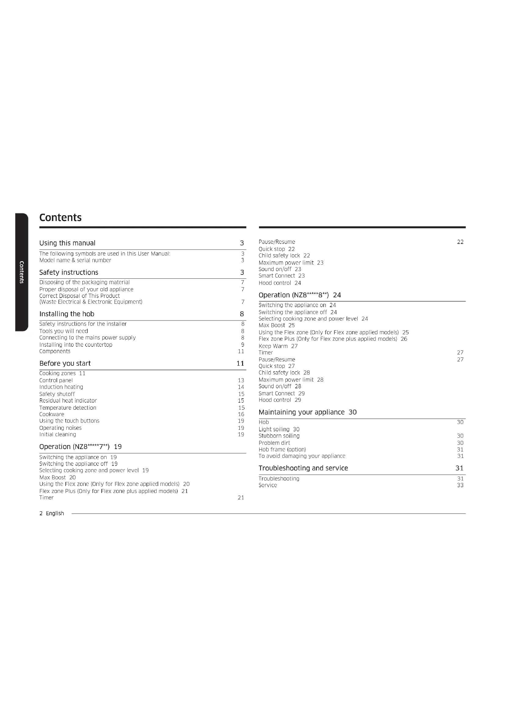 Induction Hob User manual NZ84C5047** / NZ85C5047** / NZ84C6057** / NZ84C6058** / NZ85C6057** / NZ85C6058**2 English Contents Contents Pause/Resume 22 Quick stop 22 Child safety lock 22 Maximum power limit 23 Sound on/off 23 Smart Connect 23 Hood control 24 Operation (NZ8*****8**) 24 Switching the appliance on 24 Switching the appliance off 24 Selecting cooking zone and power level 24 Max Boost 25 Using the Flex zone (Only for Flex zone applied models) 25 Flex zone Plus (Only for Flex zone plus applied models) 26 Keep Warm 27 Timer 27 Pause/Resume 27 Quick stop 27 Child safety lock 28 Maximum power limit 28 Sound on/off 28 Smart Connect 29 Hood control 29 Maintaining your appliance 30 Hob 30 Light soiling 30 Stubborn soiling 30 Problem dirt 30 Hob frame (option) 31 To avoid damaging your appliance 31 Troubleshooting and service 31 Troubleshooting 31 Service 33 Contents Using this manual 3 The following symbols are used in this User Manual: 3 Model name & serial number 3 Safety instructions 3 Disposing of the packaging material 7 Proper disposal of your old appliance 7 Correct Disposal of This Product (Waste Electrical & Electronic Equipment) 7 Installing the hob 8 Safety instructions for the installer 8 Tools you will need 8 Connecting to the mains power supply 8 Installing into the countertop 9 Components 11 Before you start 11 Cooking zones 11 Control panel 13 Induction heating 14 Safety shutoff 15 Residual heat indicator 15 Temperature detection 15 Cookware 16 Using the touch buttons 19 Operating noises 19 Initial cleaning 19 Operation (NZ8*****7**) 19 Switching the appliance on 19 Switching the appliance off 19 Selecting cooking zone and power level 19 Max Boost 20 Using the Flex zone (Only for Flex zone applied models) 20 Flex zone Plus (Only for Flex zone plus applied models) 21 Timer 21English 3 Using this manual Using this manual Please take the time to read this owner’s manual, paying particular attention to the safety information contained in the following section, before using your appliance. Keep this manual for future reference. If transferring ownership of the appliance, please remember to pass the manual on to the new owner. The following symbols are used in this User Manual: WARNING Hazards or unsafe practices that may result in severe personal injury or death. CAUTION Hazards or unsafe practices that may result in minor personal injury or property damage. CAUTION To reduce the risk of re, explosion, electric shock, or personal injury when using your hob, follow these basic safety precaution. NOTE Useful tips, recommendations, or information that helps users manipulate the product. Model name & serial number Both the model name and the serial number are labeled underneath the hob base. For later use, write down the information or attach the additional product label (located on the top of the product) onto the current page. Model Name Serial Number Safety instructions The safety aspects of this appliance comply with all accepted technical and safety standards. However, as manufacturers we also believe it is our responsibility to familiarize you with the following safety instructions. WARNING This appliance is not intended for use by persons (including children) with reduced physical, sensory or mental capabilities, or lack of experience and knowledge, unless they have been given supervision or instruction concerning use of the appliance by a person responsible for their safety. Children should be supervised to ensure that they do not play with the appliance. This appliance can be used by children aged from 8 years and above and persons with reduced physical, sensory or mental capabilities or lack of experience and knowledge if they have been given supervision or instruction concerning use of the appliance in a safe way and understand the hazards involved. Children shall not play with the appliance. Cleaning and user maintenance shall not be made by children without supervision. The means for disconnection must be incorporated in the xed wiring in accordance with the wiring rules.4 English Safety instructions Safety instructions The appliance is not intended to be operated by means of an external timer or separate remote-control system. CAUTION: The cooking process has to be supervised. A short term cooking process has to be supervised continuously. The appliance must not be installed behind a decorative door in order to avoid overheating.