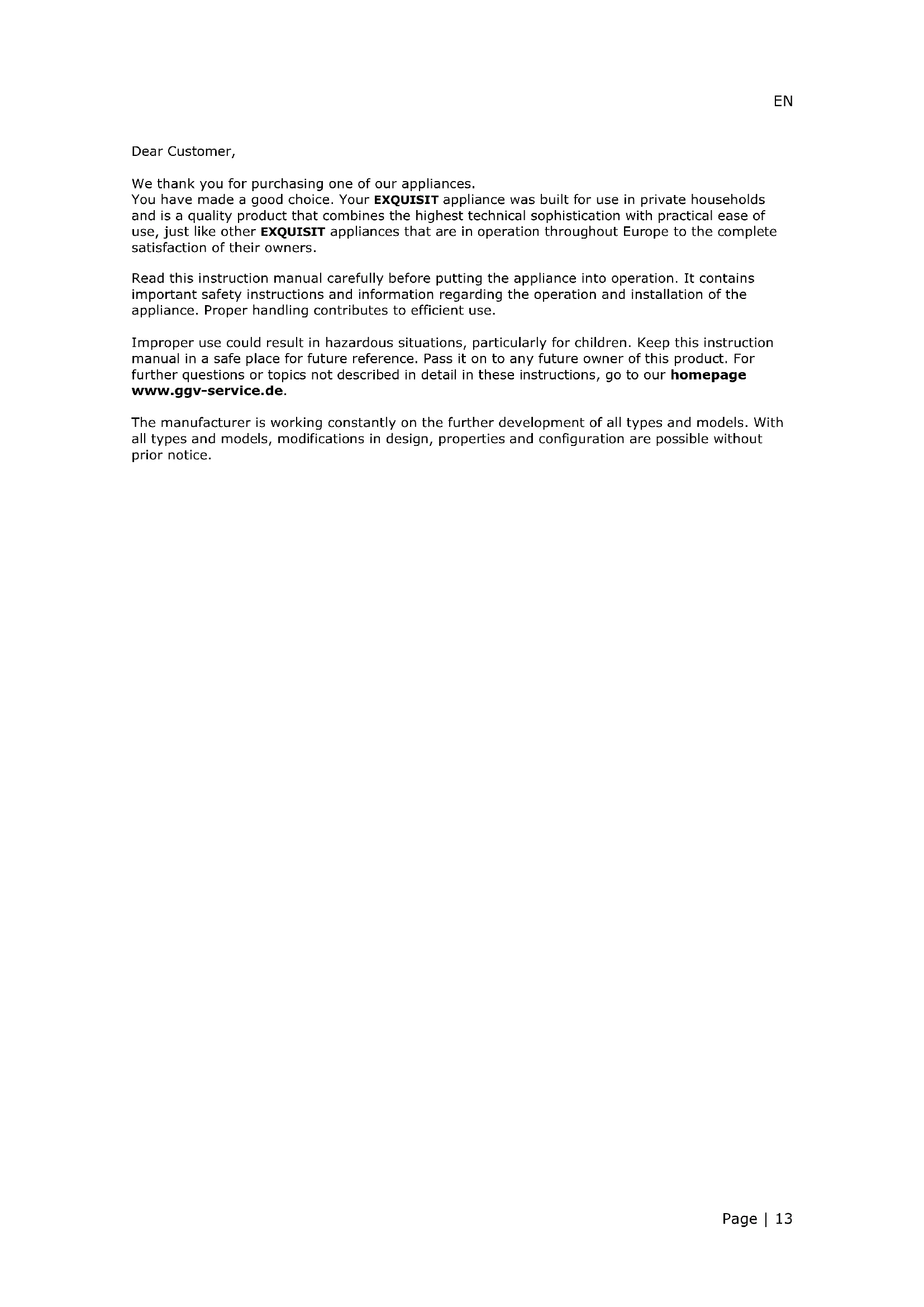 The following terms describing the preconditions for and scope of our warranty, do not infringe the warranty rights of the ultimate buyer. Our warranty for this appliance is granted under the following terms: As the purchaser of an Exquisit appliance, you have a manufacturer's warranty (2 years from the date of purchase). During this warranty period, you can make your warranty claims directly on the manufacturer’s Service platform at www.ggv-service.de. If an additional warranty is concluded between you and your dealer, all claims against the manufacturer will become void after the end of the 24-month manufacturer’s warranty. In this case, please contact your dealer directly. Warranty period The warranty period is 24 months from the date of purchase (proof of purchase must be presented). During the first 6 months, After Sales Service will fix defects in the appliance free of charge, on condition that the appliance is accessible for repairs without any great effort. During the following 18 months, the buyer is obliged to prove that the defect already existed at the time of delivery. In the case of commercial use (e.g. in hotels, canteens) or joint use by several households, the warranty period is 12 months from the date of purchase (proof of purchase must be presented). During the first 6 months, After Sales Service will fix defects in the appliance free of charge, on condition that the appliance is accessible for repairs without any great effort. During the following 6 months, the buyer is obliged to prove that the defect already existed at the time of delivery. The claim under warranty does not prolong the warranty period for either the appliance or for newly installed parts. Scope of the defect remedy Within the aforementioned periods, we shall remedy all defects in the appliance that are demonstrably due to defective workmanship or material defects. Replaced parts become our property. The warranty does not cover: Normal wear and tear, intentional or negligent damage, damage caused by non-compliance with the operating instructions, improper set-up or installation or by connection to incorrect mains voltage, damage due to chemical or electrothermal effects or due to other abnormal environmental conditions, glass, paint or enamel damage and possible colour differences as well as defective bulbs. Defects in the appliance resulting from transport damage are also not covered. We also do not provide any services if - without our special written approval - work has been carried out on the appliance by unauthorised persons or parts of third-party origin have been used. This limitation shall not apply to faultless work carried out by a qualified person using our original parts to adapt the appliance to the technical safety regulations of another EU member state. Scope Our warranty applies to appliances purchased and in operation in the Federal Republic of Germany or Austria. In the case of complaints about defective appliances, the sender's and recipient's addresses must be in the Federal Republic of Germany or Austria. For appliances purchased and operated in other European countries, the warranty conditions of the seller apply.