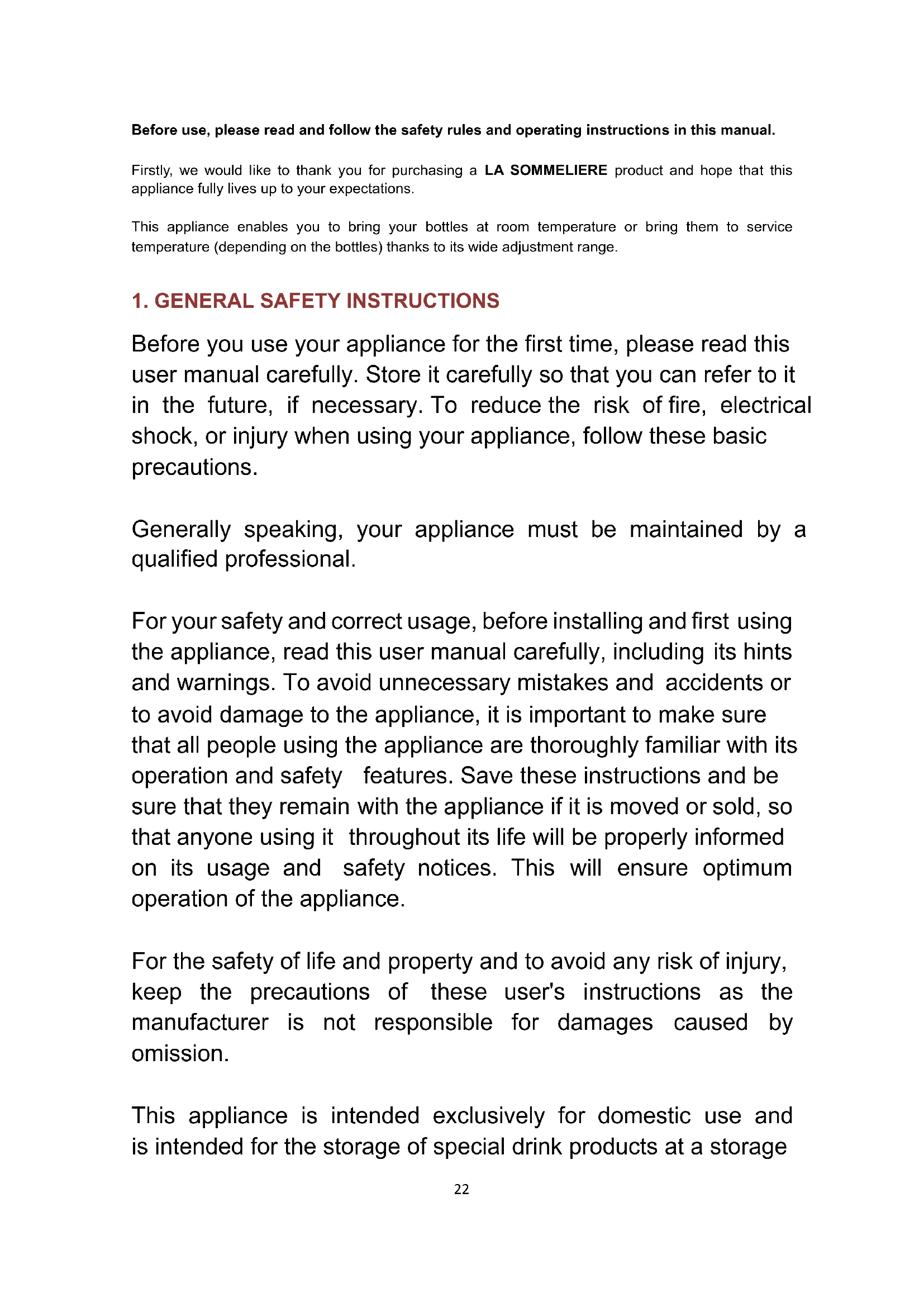 - This appliance is intended to be used exclusively for the storage of wine.