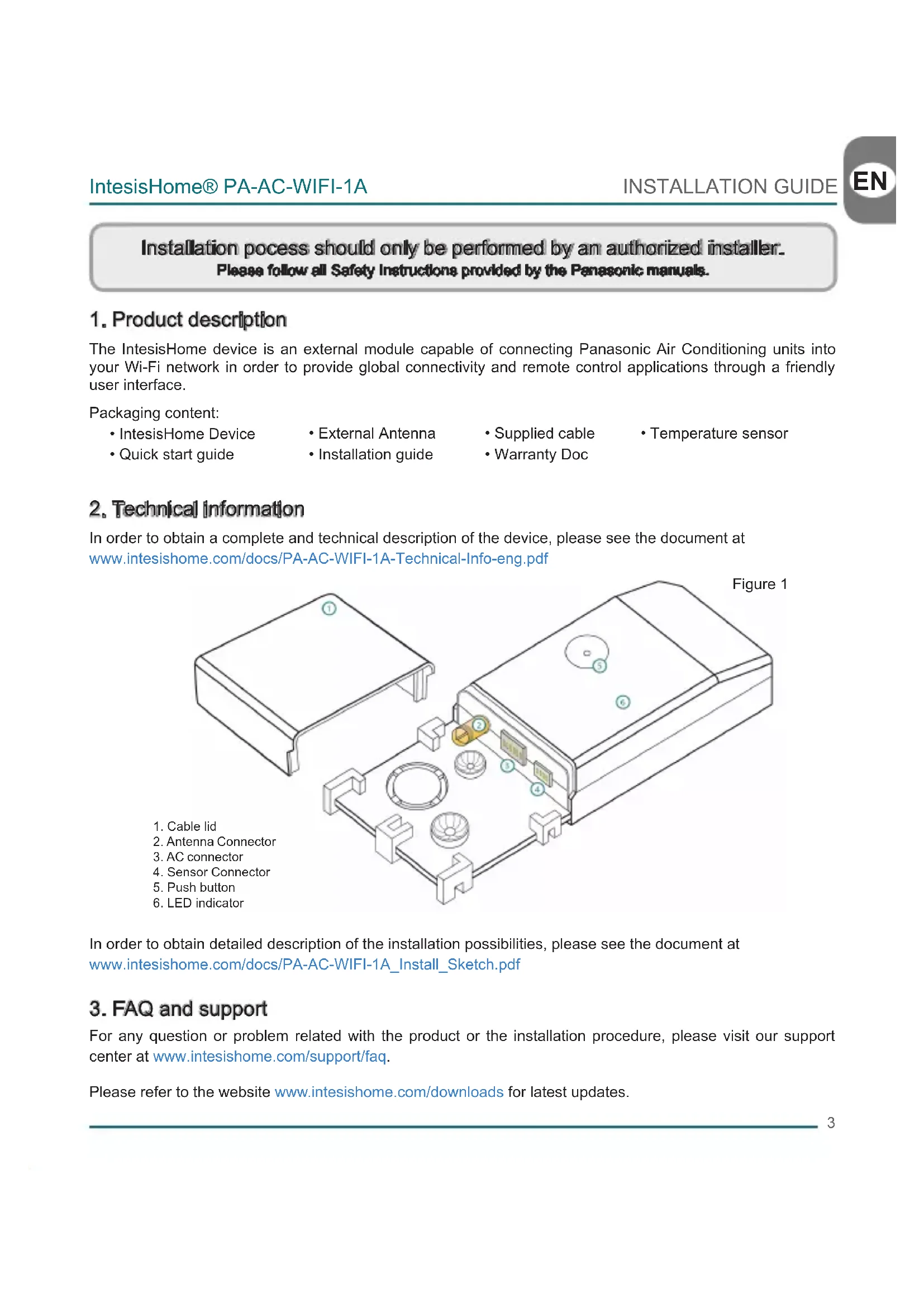 The IntesisHome device is an external module capable of connecting Panasonic Air Conditioning units into your Wi-Fi network in order to provide global connectivity and remote control applications through a friendly user interface. Packaging content: In order to obtain a complete and technical description of the device, please see the document at www.intesishome.com/docs/PA-AC-WIFI-1A-Technical-Info-eng.pdf In order to obtain detailed description of the installation possibilities, please see the document at www.intesishome.com/docs/PA-AC-WIFI-1A_Install_Sketch.pdf For any question or problem related with the product or the installation procedure, please visit our support center at www.intesishome.com/support/faq. Please refer to the website www.intesishome.com/downloads for latest updates. Installation pocess should only be performed by an authorized installer. Please follow all Safety Instructions provided by the Panasonic manuals.