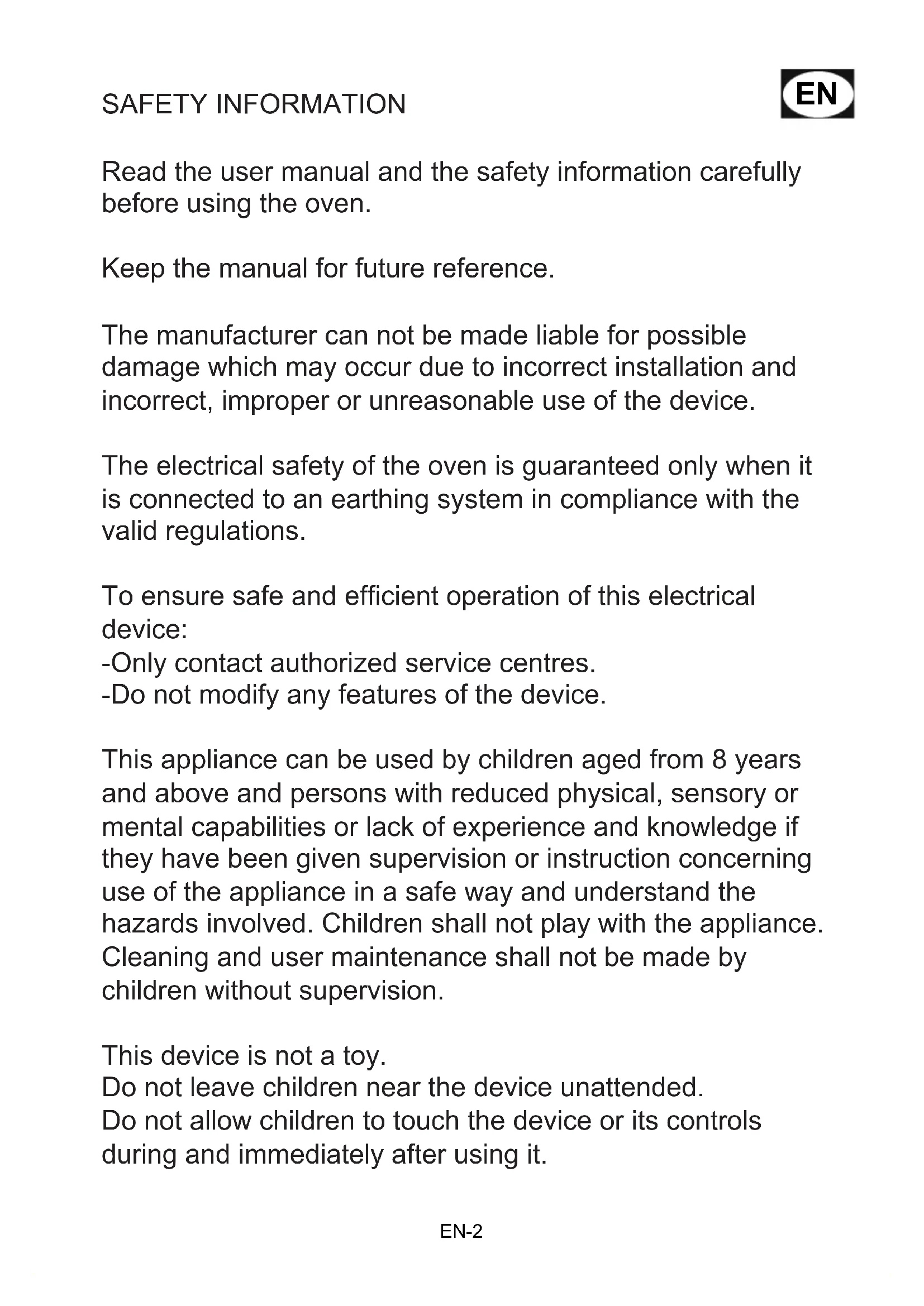 EN-2CAUTION: In order to avoid a hazard due to inadvertent resetting of the thermal cut-out, this appliance must not be supplied through an external switching device, such as a timer, or connected to a circuit that is regularly switched on and off by the utility. Ensure that the device is installed in a way that allows to disconnect it from the power supply, with a contact opening distance that ensures complete disconnection in category III overvoltage conditions. Means for disconnection must be incorporated in the fixed wiring in accordance with the wiring rules. Only use the temperature probe recommended for this oven. The appliance shall not be installed behind a decorative door in order to avoid overheating.