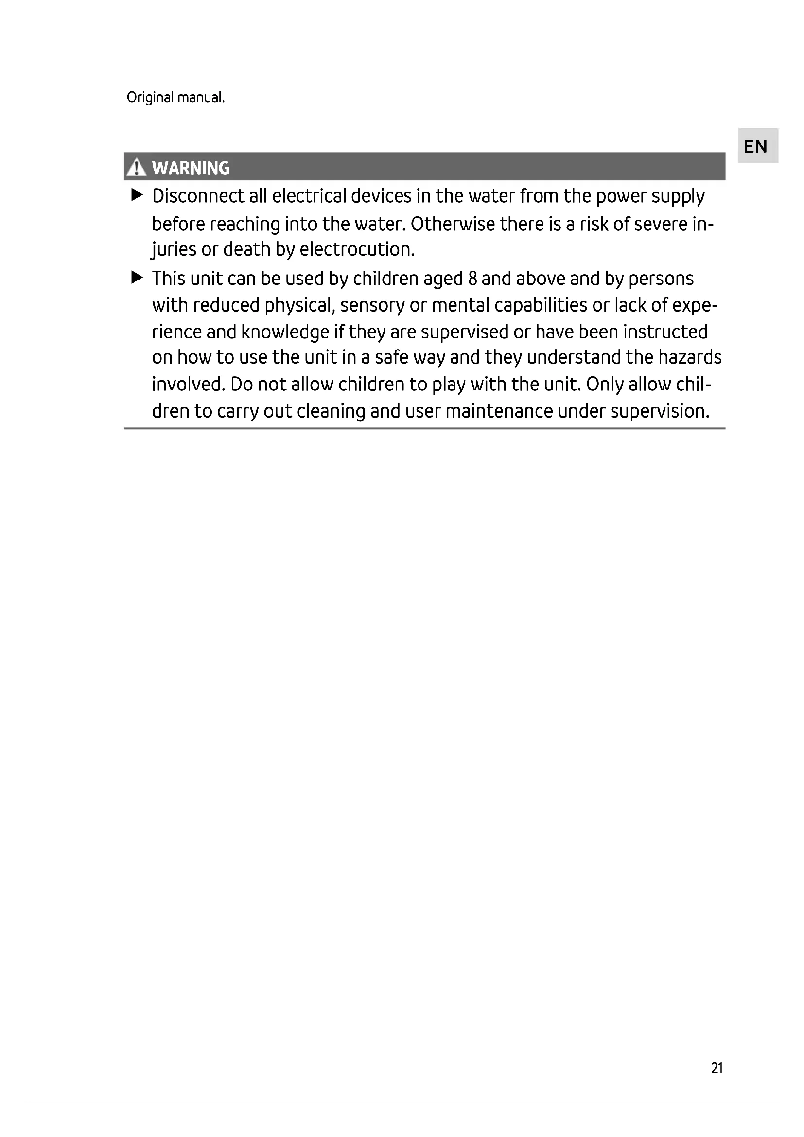 WARNING WARNING Disconnect all electrical devices in the water from the power supply before reaching into the water. Otherwise there is a risk of severe in- juries or death by electrocution. This unit can be used by children aged 8 and above and by persons with reduced physical, sensory or mental capabilities or lack of expe- rience and knowledge if they are supervised or have been instructed on how to use the unit in a safe way and they understand the hazards involved. Do not allow children to play with the unit. Only allow chil- dren to carry out cleaning and user maintenance under supervision.22 Safety information Electrical connection