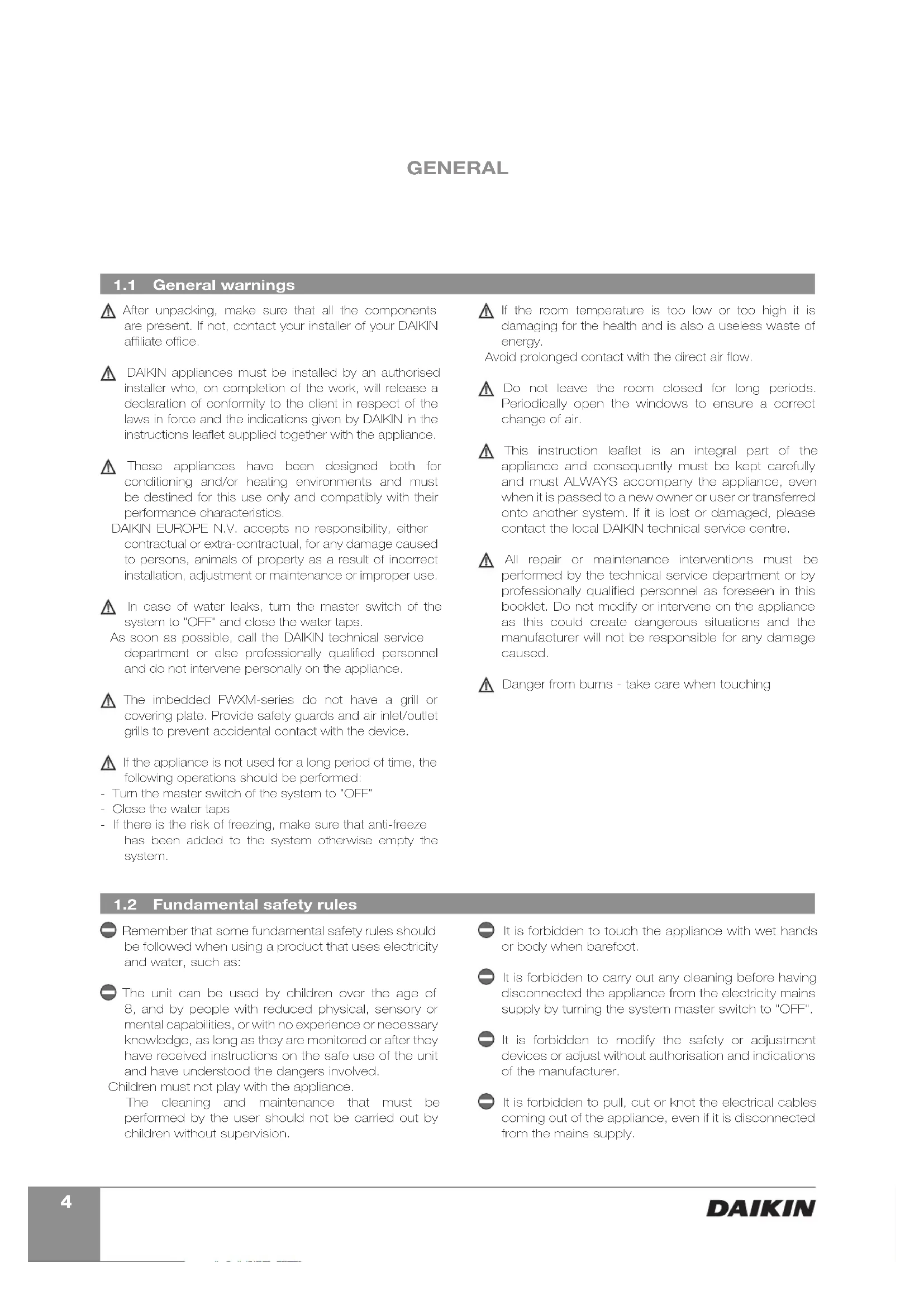 General warnings Fundamental safety rules After unpacking, make sure that all the components are present. If not, contact your installer of your DAIKIN affiliate office. DAIKIN appliances must be installed by an authorised installer who, on completion of the work, will release a declaration of conformity to the client in respect of the laws in force and the indications given by DAIKIN in the instructions leaflet supplied together with the appliance. These appliances have been designed both for conditioning and/or heating environments and must be destined for this use only and compatibly with their performance characteristics. DAIKIN EUROPE N.V. accepts no responsibility, either contractual or extra-contractual, for any damage caused to persons, animals of property as a result of incorrect installation, adjustment or maintenance or improper use. In case of water leaks, turn the master switch of the system to "OFF" and close the water taps. As soon as possible, call the DAIKIN technical service department or else professionally qualified personnel and do not intervene personally on the appliance. The imbedded FWXM-series do not have a grill or covering plate. Provide safety guards and air inlet/outlet grills to prevent accidental contact with the device. If the appliance is not used for a long period of time, the following operations should be performed: - Turn the master switch of the system to "OFF" - Close the water taps - If there is the risk of freezing, make sure that anti-freeze has been added to the system otherwise empty the system. If the room temperature is too low or too high it is damaging for the health and is also a useless waste of energy. Avoid prolonged contact with the direct air flow. Do not leave the room closed for long periods. Periodically open the windows to ensure a correct change of air. This instruction leaflet is an integral part of the appliance and consequently must be kept carefully and must ALWAYS accompany the appliance, even when it is passed to a new owner or user or transferred onto another system. If it is lost or damaged, please contact the local DAIKIN technical service centre. All repair or maintenance interventions must be performed by the technical service department or by professionally qualified personnel as foreseen in this booklet. Do not modify or intervene on the appliance as this could create dangerous situations and the manufacturer will not be responsible for any damage caused. Danger from burns - take care when touching Remember that some fundamental safety rules should be followed when using a product that uses electricity and water, such as: The unit can be used by children over the age of 8, and by people with reduced physical, sensory or mental capabilities, or with no experience or necessary knowledge, as long as they are monitored or after they have received instructions on the safe use of the unit and have understood the dangers involved. Children must not play with the appliance. The cleaning and maintenance that must be performed by the user should not be carried out by children without supervision. It is forbidden to touch the appliance with wet hands or body when barefoot. It is forbidden to carry out any cleaning before having disconnected the appliance from the electricity mains supply by turning the system master switch to "OFF". It is forbidden to modify the safety or adjustment devices or adjust without authorisation and indications of the manufacturer. It is forbidden to pull, cut or knot the electrical cables coming out of the appliance, even if it is disconnected from the mains supply. GENERAL5