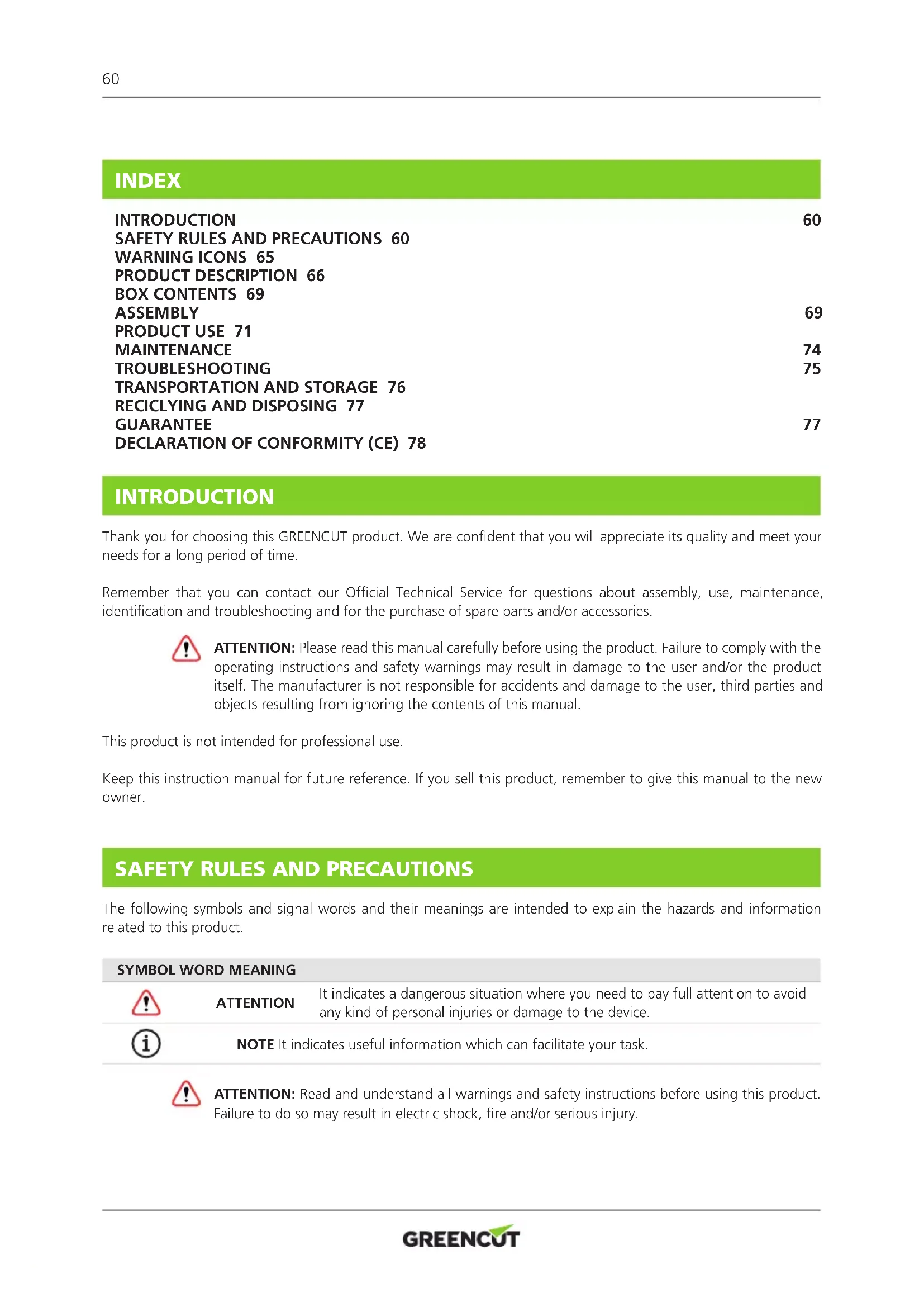ATTENTION It indicates a dangerous situation where you need to pay full attention to avoid any kind of personal injuries or damage to the device. NOTE It indicates useful information which can facilitate your task. ATTENTION: Read and understand all warnings and safety instructions before using this product. Failure to do so may result in electric shock, re and/or serious injury. INDEX INTRODUCTION 60