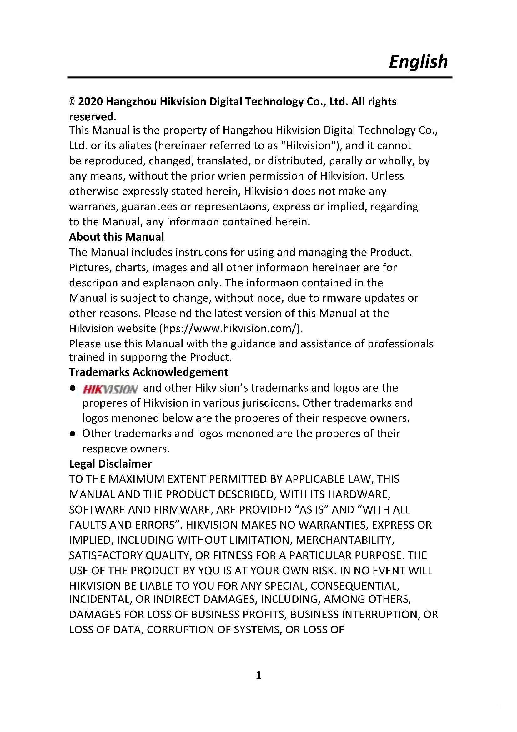 © 2020 Hangzhou Hikvision Digital Technology Co., Ltd. All rights reserved. This Manual is the property of Hangzhou Hikvision Digital Technology Co., Ltd. or its affiliates (hereinafter referred to as "Hikvision"), and it cannot be reproduced, changed, translated, or distributed, partially or wholly, by any means, without the prior written permission of Hikvision. Unless otherwise expressly stated herein, Hikvision does not make any warranties, guarantees or representations, express or implied, regarding to the Manual, any information contained herein. About this Manual The Manual includes instructions for using and managing the Product. Pictures, charts, images and all other information hereinafter are for description and explanation only. The information contained in the Manual is subject to change, without notice, due to firmware updates or other reasons. Please find the latest version of this Manual at the Hikvision website (https://www.hikvision.com/). Please use this Manual with the guidance and assistance of professionals trained in supporting the Product. Trademarks Acknowledgement and other Hikvision’s trademarks and logos are the properties of Hikvision in various jurisdictions. Other trademarks and logos mentioned below are the properties of their respective owners. Other trademarks and logos mentioned are the properties of their respective owners. Legal Disclaimer TO THE MAXIMUM EXTENT PERMITTED BY APPLICABLE LAW, THIS MANUAL AND THE PRODUCT DESCRIBED, WITH ITS HARDWARE, SOFTWARE AND FIRMWARE, ARE PROVIDED “AS IS” AND “WITH ALL FAULTS AND ERRORS”. HIKVISION MAKES NO WARRANTIES, EXPRESS OR IMPLIED, INCLUDING WITHOUT LIMITATION, MERCHANTABILITY, SATISFACTORY QUALITY, OR FITNESS FOR A PARTICULAR PURPOSE. THE USE OF THE PRODUCT BY YOU IS AT YOUR OWN RISK. IN NO EVENT WILL HIKVISION BE LIABLE TO YOU FOR ANY SPECIAL, CONSEQUENTIAL, INCIDENTAL, OR INDIRECT DAMAGES, INCLUDING, AMONG OTHERS, DAMAGES FOR LOSS OF BUSINESS PROFITS, BUSINESS INTERRUPTION, OR LOSS OF DATA, CORRUPTION OF SYSTEMS, OR LOSS OFEnglish