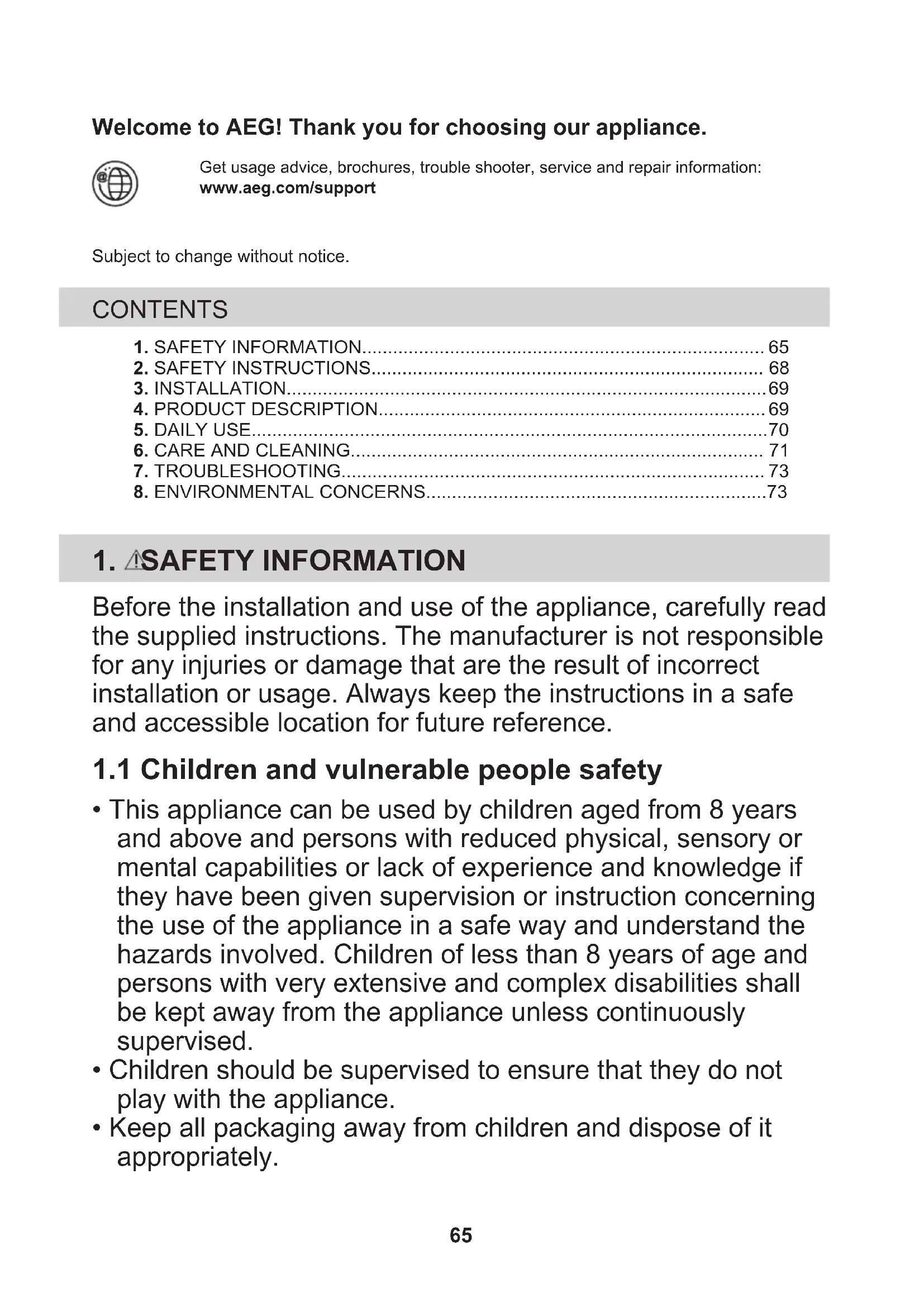 64Welcome to AEG! Thank you for choosing our appliance. Get usage advice, brochures, trouble shooter, service and repair information:www.aeg.com/supportSubject to change without notice. CONTENTS