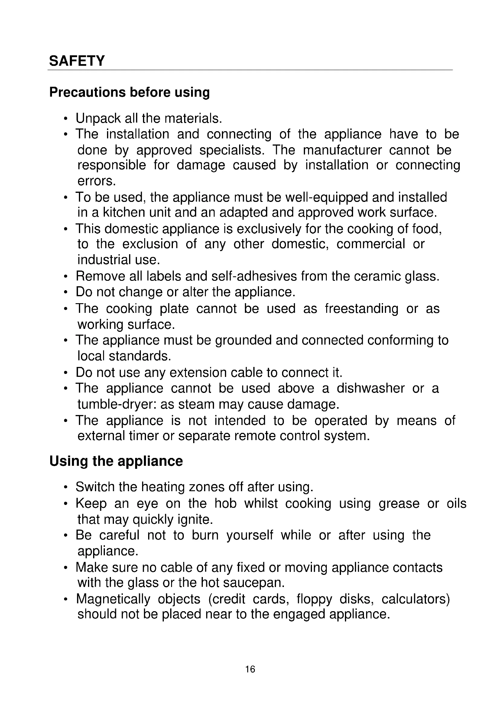 - Sugar, synthetic materials or aluminium sheets must not contact with the heating zones. These may cause breaks or other alterations of the vitroceramic glass by cooling: switch on the appliance and take them immediately out of the hot heating zone (be careful: do not burn yourself).