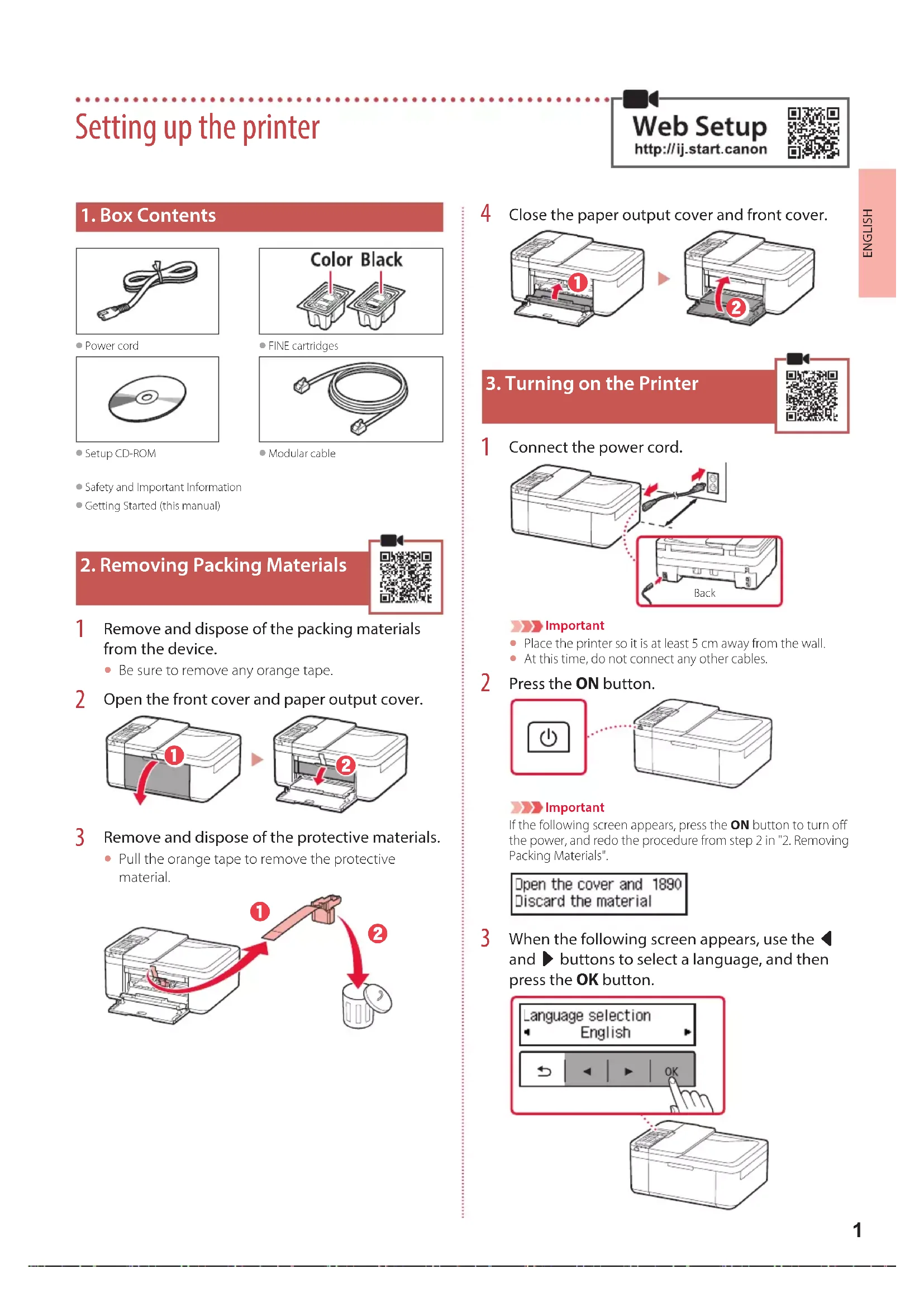 Press the ON button. ImportantIf the following screen appears, press the ON button to turn o the power, and redo the procedure from step 2 in "2. Removing Packing Materials".