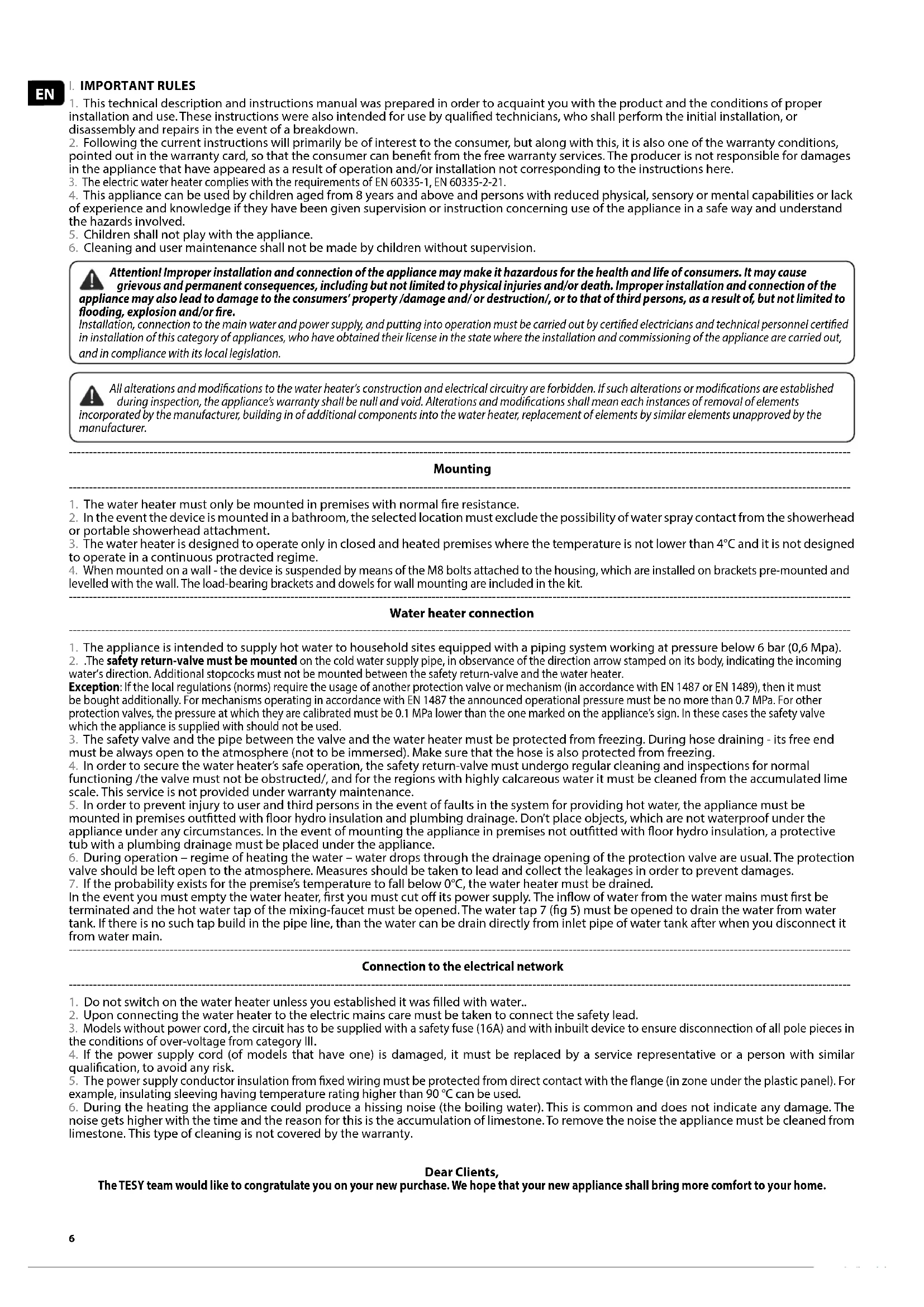 6. During the heating the appliance could produce a hissing noise (the boiling water). This is common and does not indicate any damage. The noise gets higher with the time and the reason for this is the accumulation of limestone. To remove the noise the appliance must be cleaned from limestone. This type of cleaning is not covered by the warranty. Dear Clients, The TESY team would like to congratulate you on your new purchase. We hope that your new appliance shall bring more comfort to your home.7