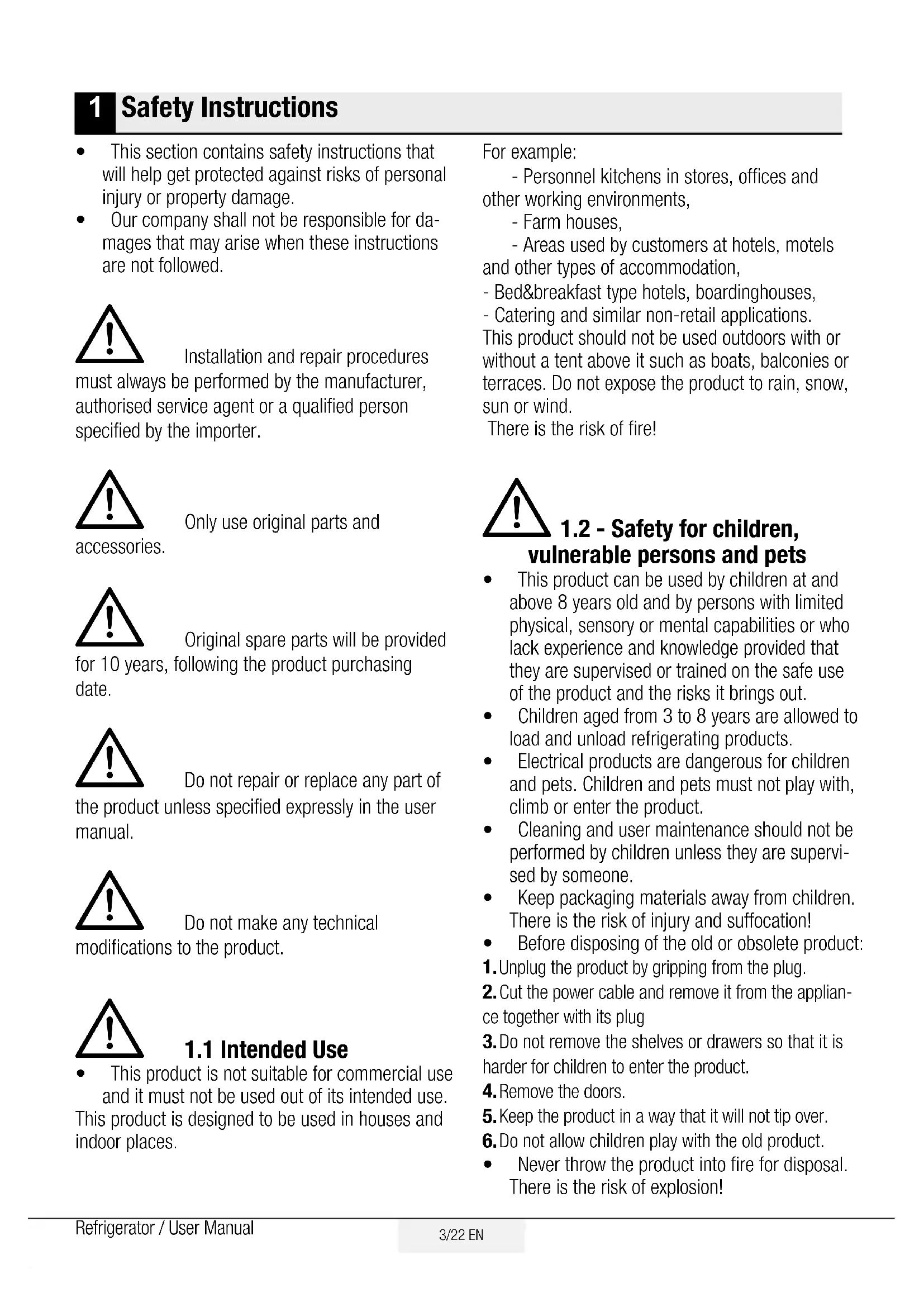 - 6.2. Protecting Plastic Surfaces 7 Troubleshooting 193/22 EN Refrigerator / User Manual This section contains safety instructions that will help get protected against risks of personal injury or property damage. Our company shall not be responsible for da- mages that may arise when these instructions are not followed. A Installation and repair procedures must always be performed by the manufacturer, authorised service agent or a qualified person specified by the importer. A Only use original parts and accessories. A Original spare parts will be provided for 10 years, following the product purchasing date. A Do not repair or replace any part of the product unless specified expressly in the user manual. A Do not make any technical modifications to the product. A 1.1 Intended Use This product is not suitable for commercial use and it must not be used out of its intended use. This product is designed to be used in houses and indoor places. For example: - Personnel kitchens in stores, offices and other working environments, - Farm houses, - Areas used by customers at hotels, motels and other types of accommodation, - Bed&breakfast type hotels, boardinghouses, - Catering and similar non-retail applications. This product should not be used outdoors with or without a tent above it such as boats, balconies or terraces. Do not expose the product to rain, snow, sun or wind. There is the risk of fire! A 1.2 - Safety for children, vulnerable persons and pets This product can be used by children at and above 8 years old and by persons with limited physical, sensory or mental capabilities or who lack experience and knowledge provided that they are supervised or trained on the safe use of the product and the risks it brings out. Children aged from 3 to 8 years are allowed to load and unload refrigerating products. Electrical products are dangerous for children and pets. Children and pets must not play with, climb or enter the product. Cleaning and user maintenance should not be performed by children unless they are supervi- sed by someone. Keep packaging materials away from children. There is the risk of injury and suffocation! Before disposing of the old or obsolete product: p. 18