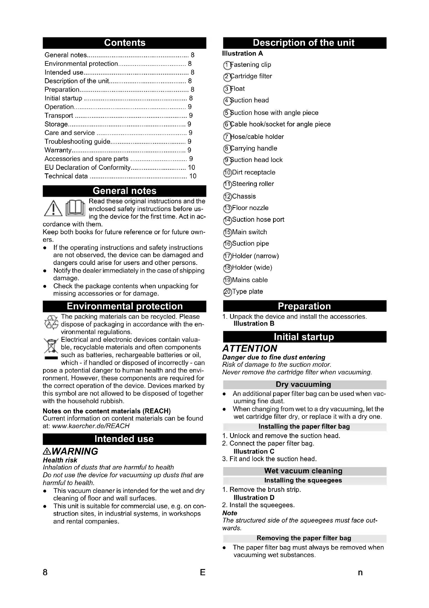 H05VV-F 2x1,0 H05VV-F 2x1,0 H05VV-F 2x1,0 Teilenummer (EU) 9.770-820.0 9.770-820.0 9.770-820.0 Kabellänge m 6,5 6,5 6,58English Contents General notes Read these original instructions and the enclosed safety instructions before us- ing the device for the first time. Act in ac- cordance with them. Keep both books for future reference or for future own- ers. ● If the operating instructions and safety instructions are not observed, the device can be damaged and dangers could arise for users and other persons. ● Notify the dealer immediately in the case of shipping damage. ● Check the package contents when unpacking for missing accessories or for damage. Environmental protection The packing materials can be recycled. Please dispose of packaging in accordance with the en- vironmental regulations. Electrical and electronic devices contain valua- ble, recyclable materials and often components such as batteries, rechargeable batteries or oil, which - if handled or disposed of incorrectly - can pose a potential danger to human health and the envi- ronment. However, these components are required for the correct operation of the device. Devices marked by this symbol are not allowed to be disposed of together with the household rubbish. Notes on the content materials (REACH) Current information on content materials can be found at: www.kaercher.de/REACH Intended use 몇 WARNING Health risk Inhalation of dusts that are harmful to health Do not use the device for vacuuming up dusts that are harmful to health. ● This vacuum cleaner is intended for the wet and dry cleaning of floor and wall surfaces. ● This unit is suitable for commercial use, e.g. on con- struction sites, in industrial systems, in workshops and rental companies. Description of the unit Illustration A 1 Fastening clip 2 Cartridge filter 3 Float 4 Suction head 5 Suction hose with angle piece 6 Cable hook/socket for angle piece 7 Hose/cable holder 8 Carrying handle 9 Suction head lock 10 Dirt receptacle 11 Steering roller 12 Chassis 13 Floor nozzle 14 Suction hose port 15 Main switch 16 Suction pipe 17 Holder (narrow) 18 Holder (wide) 19 Mains cable 20 Type plate Preparation