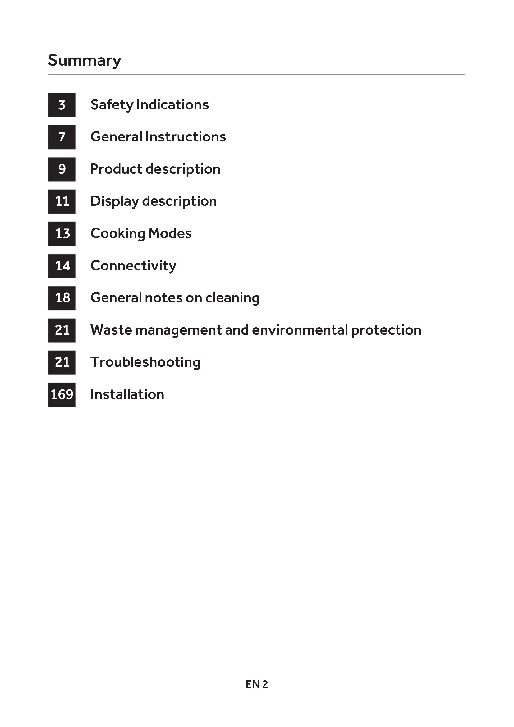 148GREN 2 Safety Indications General Instructions Product description Display description Cooking Modes Connectivity General notes on cleaning Waste management and environmental protection Troubleshooting Installation Summary