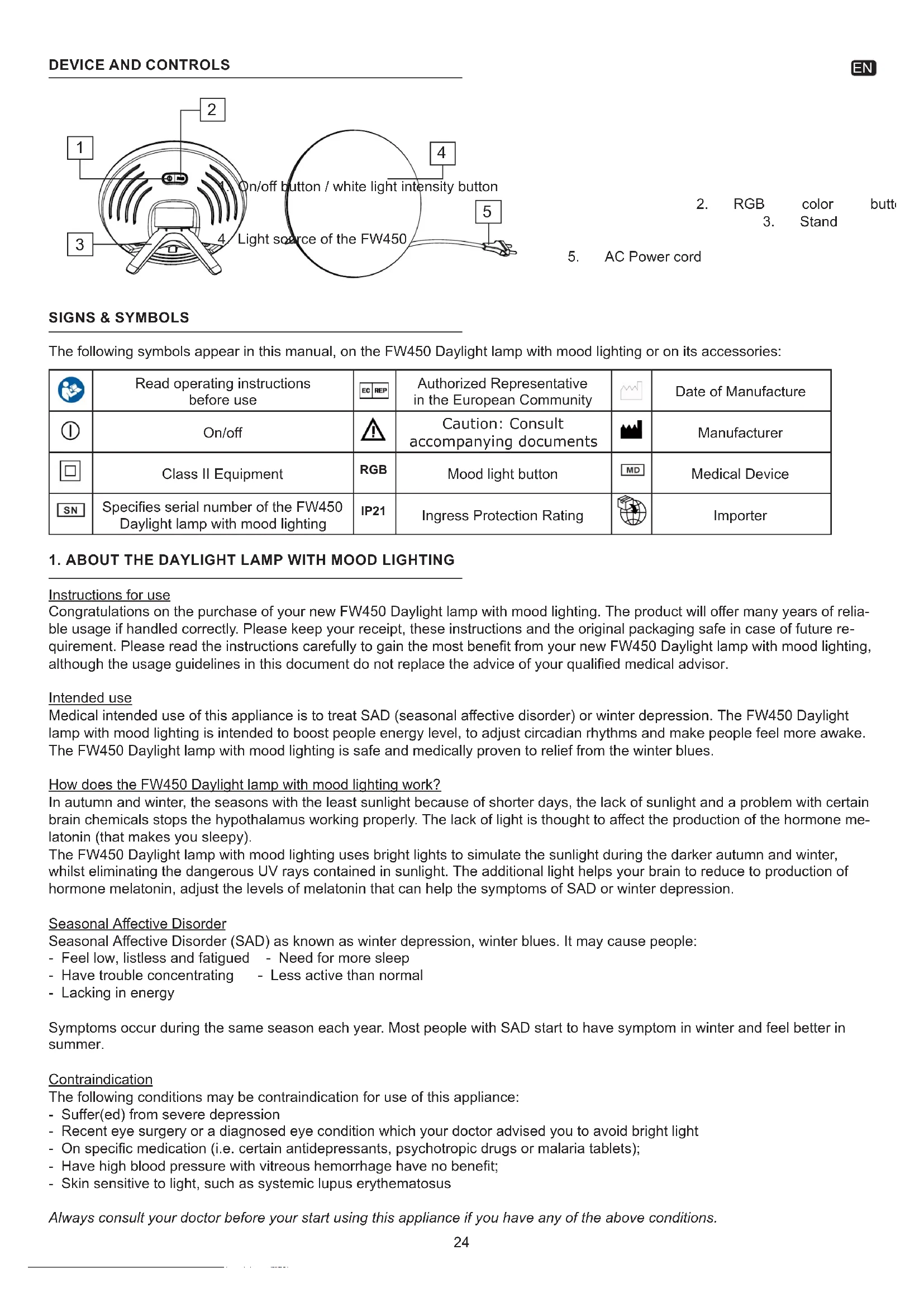 Instructions for use Congratulations on the purchase of your new FW450 Daylight lamp with mood lighting. The product will oer many years of relia- ble usage if handled correctly. Please keep your receipt, these instructions and the original packaging safe in case of future re- quirement. Please read the instructions carefully to gain the most benet from your new FW450 Daylight lamp with mood lighting, although the usage guidelines in this document do not replace the advice of your qualied medical advisor. Intended use Medical intended use of this appliance is to treat SAD (seasonal aective disorder) or winter depression. The FW450 Daylight lamp with mood lighting is intended to boost people energy level, to adjust circadian rhythms and make people feel more awake. The FW450 Daylight lamp with mood lighting is safe and medically proven to relief from the winter blues. How does the FW450 Daylight lamp with mood lighting work? In autumn and winter, the seasons with the least sunlight because of shorter days, the lack of sunlight and a problem with certain brain chemicals stops the hypothalamus working properly. The lack of light is thought to aect the production of the hormone me- latonin (that makes you sleepy). The FW450 Daylight lamp with mood lighting uses bright lights to simulate the sunlight during the darker autumn and winter, whilst eliminating the dangerous UV rays contained in sunlight. The additional light helps your brain to reduce to production of hormone melatonin, adjust the levels of melatonin that can help the symptoms of SAD or winter depression. Seasonal Aective Disorder Seasonal Aective Disorder (SAD) as known as winter depression, winter blues. It may cause people: - Feel low, listless and fatigued - Need for more sleep - Have trouble concentrating - Less active than normal - Lacking in energy Symptoms occur during the same season each year. Most people with SAD start to have symptom in winter and feel better in summer. Contraindication The following conditions may be contraindication for use of this appliance: - Suer(ed) from severe depression - Recent eye surgery or a diagnosed eye condition which your doctor advised you to avoid bright light - On specic medication (i.e. certain antidepressants, psychotropic drugs or malaria tablets); - Have high blood pressure with vitreous hemorrhage have no benet; - Skin sensitive to light, such as systemic lupus erythematosus Always consult your doctor before your start using this appliance if you have any of the above conditions.