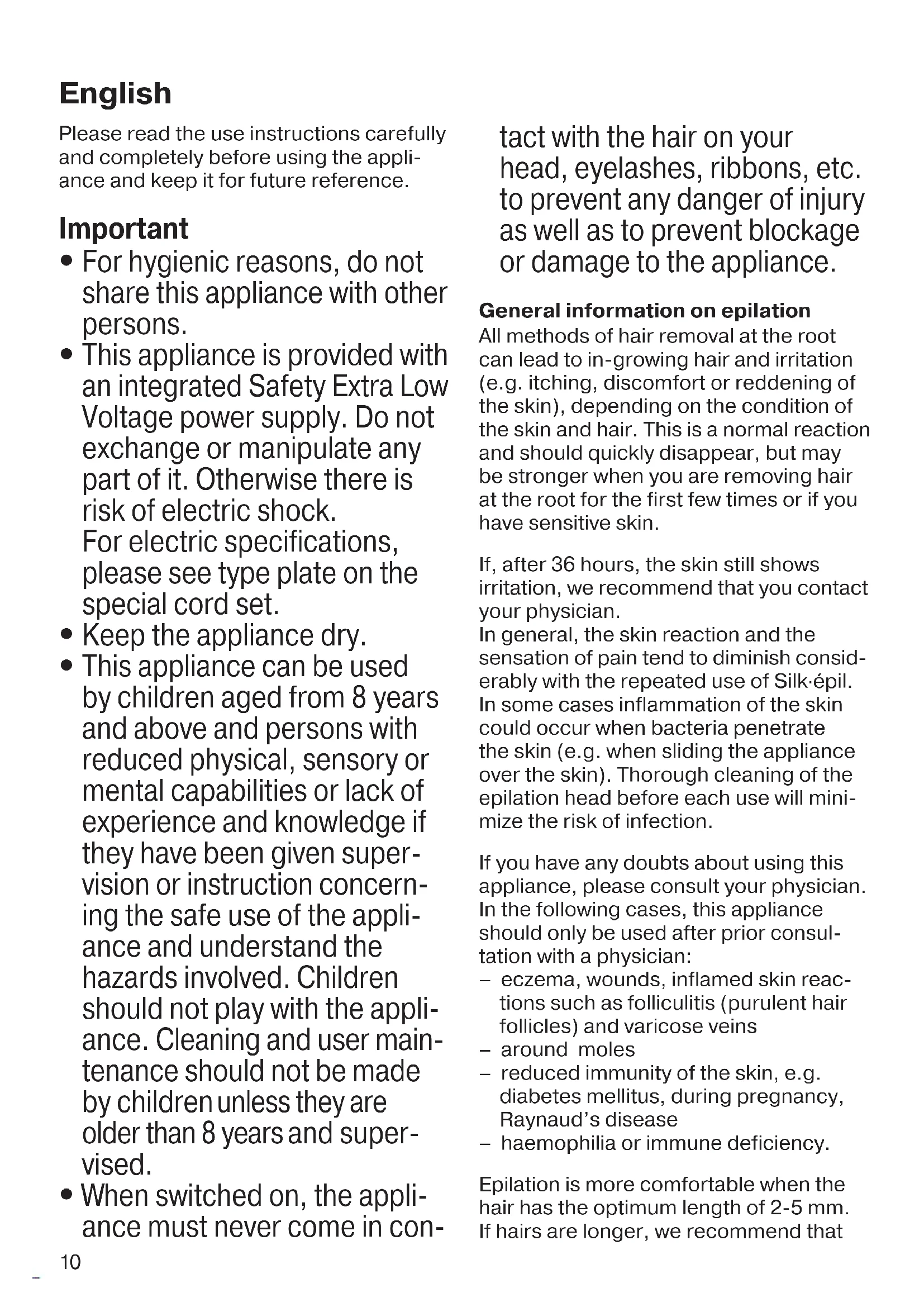 When switched on, the appli- ance must never come in con- tact with the hair on your head, eyelashes, ribbons, etc. to prevent any danger of injury as well as to prevent blockage or damage to the appliance. General information on epilation All methods of hair removal at the root can lead to in-growing hair and irritation (e.g. itching, discomfort or reddening of the skin), depending on the condition of the skin and hair. This is a normal reaction and should quickly disappear, but may be stronger when you are removing hair at the root for the first few times or if you have sensitive skin. If, after 36 hours, the skin still shows irritation, we recommend that you contact your physician. In general, the skin reaction and the sensation of pain tend to diminish consid- erably with the repeated use of Silk·épil. In some cases inflammation of the skin could occur when bacteria penetrate the skin (e.g. when sliding the appliance over the skin). Thorough cleaning of the epilation head before each use will mini- mize the risk of infection. If you have any doubts about using this appliance, please consult your physician. In the following cases, this appliance should only be used after prior consul- tation with a physician: – eczema, wounds, inflamed skin reac- tions such as folliculitis (purulent hair follicles) and varicose veins – around moles – reduced immunity of the skin, e.g. diabetes mellitus, during pregnancy, Raynaud’s disease – haemophilia or immune deficiency. Epilation is more comfortable when the hair has the optimum length of 2-5 mm. If hairs are longer, we recommend that 91618385_SE_3273_3274_GROCERY_S6-60.indd 1091618385_SE_3273_3274_GROCERY_S6-60.indd 10 22.08.17 08:3022.08.17 08:30 CSS APPROVED Effective Date 25Aug2017 GMT - Printed 22Nov2017 Page 10 of 6011 you first shave (see section B) and then epilate the shorter, regrowing hair a week later. Fine, re-growing hair might not grow up to the skin surface. The regular use of massage sponges (e.g. after showering) or exfoliation peelings help to prevent in-growing hair as the gentle scrubbing action removes the upper skin layer and fine hair can get through to the skin surface. Description 1 Massaging rollers attachment 2 Epilation head with tweezer element 3 Release buttons 4 On/off switch with incorporated light 5 Socket 6 Special cord set 7 Shaver head attachment with trimmer cap A How to epilate
