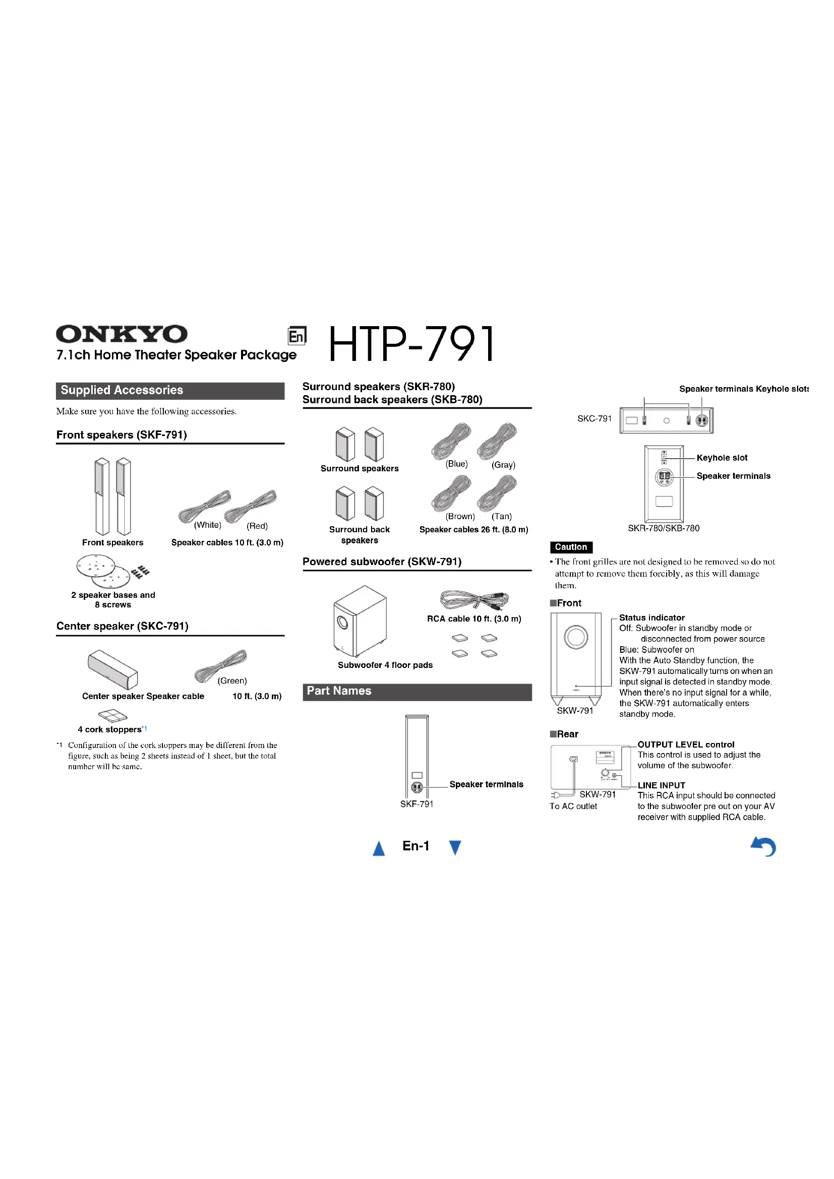 (White)(Red)(Green)Surround speakersSurround back speakersSpeaker cables 26 ft. (8.0 m)RCA cable 10 ft. (3.0 m) Subwoofer 4 floor pads Part Names (Blue)(Gray)(Brown)(Tan)Speaker terminals SKF-791Speaker terminals Keyhole slotsSKC-791Speaker terminals Keyhole slot SKR-780/SKB-780Status indicatorOff: Subwoofer in standby mode or disconnected from power sourceBlue: Subwoofer onWith the Auto Standby function, the SKW-791 automatically turns on when an input signal is detected in standby mode. When there’s no input signal for a while, the SKW-791 automatically enters standby mode.SKW-791To AC outletOUTPUT LEVEL controlThis control is used to adjust the volume of the subwoofer.LINE INPUTThis RCA input should be connected to the subwoofer pre out on your AV receiver with supplied RCA cable.SKW-791 HTP-791En-2 Note