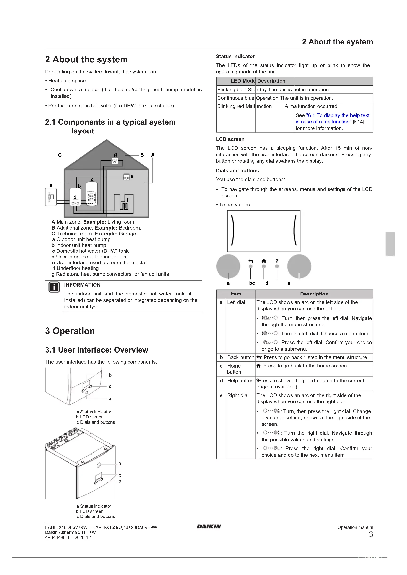 - If yes, make sure that the room where you want to purge air is sufficiently ventilated. Reason: Refrigerant might leak into the water circuit, and subsequently into the room when you purge air from the heat emitters or collectors. 7 Disposal NOTICE Do NOT try to dismantle the system yourself: dismantling of the system, treatment of the refrigerant, oil and other parts MUST comply with applicable legislation. Units MUST be treated at a specialised treatment facility for reuse, recycling and recovery. 8 Glossary DHW = Domestic hot water Hot water used, in any type of building, for domestic purposes. LWT = Leaving water temperature Water temperature at the water outlet of the unit.Inhaltsverzeichnis Betriebsanleitung EABH/X16DF6V+9W + EAVH/X16S(U)18+23DA6V+9WDaikin Altherma 3 H F+W4P644480-1 – 2020.12 Inhaltsverzeichnis 1 Informationen zu diesem Dokument 16 2 Über das System 17