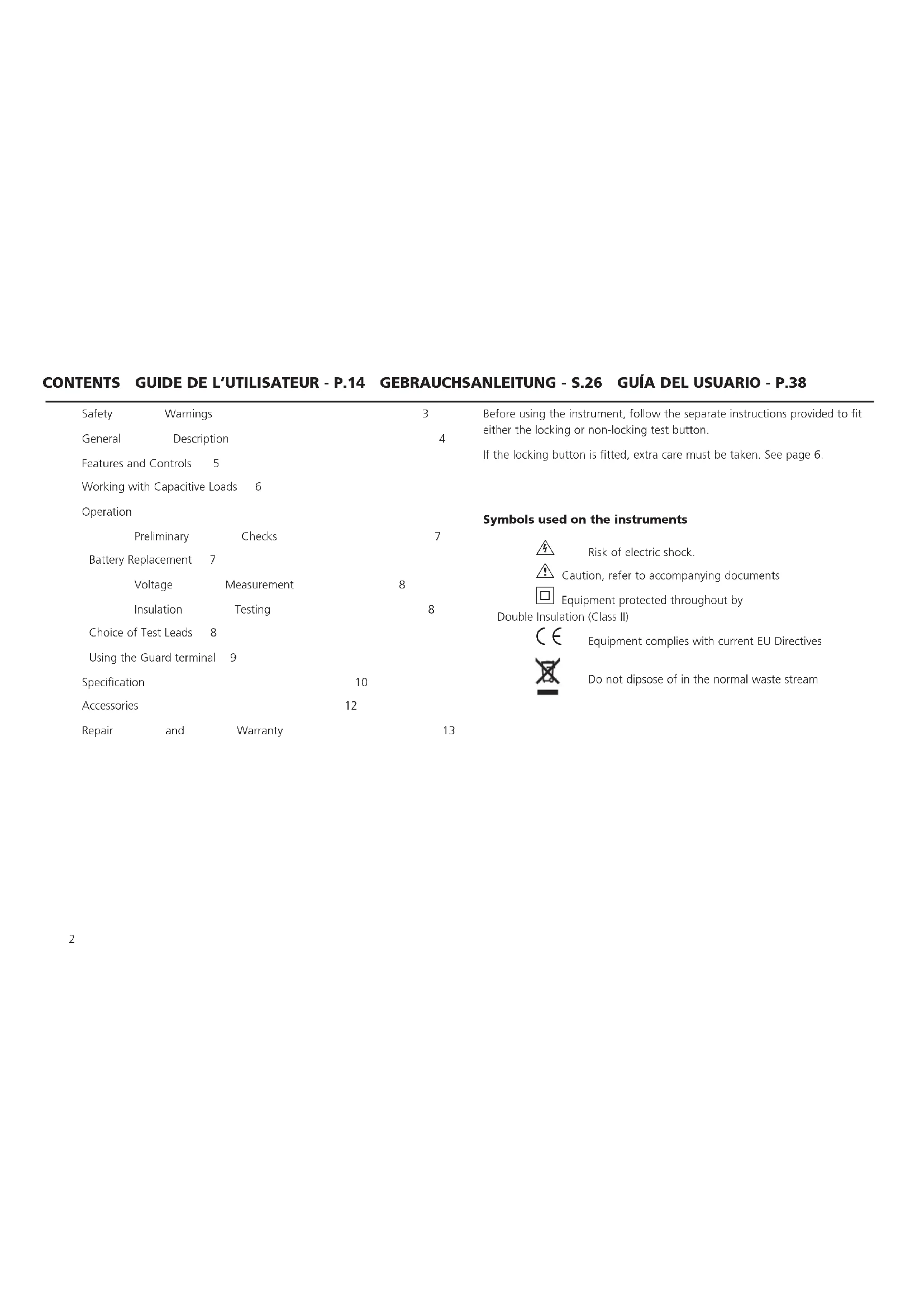 The instrument circuit contains static sensitive devices, and care must be taken in handling the printed circuit board. If the protection of an instrument has been impaired it should not be used, and be sent for repair by suitably trained and qualified personnel. The protection is likely to be impaired if, for example, the instrument shows visible damage, fails to perform the intended measurements, has been subjected to prolonged storage under unfavourable conditions, or has been exposed to severe transport stresses. New Instruments are Guaranteed for 1 Year from the Date of Purchase by the User. Note: Any unauthorized prior repair or adjustment will automatically invalidate the Warranty. Instrument Repair and Spare Parts For service requirements for Megger Instruments contact: Megger Limited or Megger Archcliffe Road Valley Forge Corporate Center Dover 2621 Van Buren Avenue Kent, CT17 9EN. Norristown, PA 19403 England. U.S.A. Tel: +44 (0) 1304 502243 Tel: +1 (610) 676-8579 Fax: +44 (0) 1304 207342 Fax: +1 (610) 676-8625 ukenquires@megger.com usenquires@megger.com or an approved repair company. Approved Repair Companies A number of independent instrument repair companies have been approved for repair work on most Megger instruments, using genuine Megger spare parts. Consult the Appointed Distributor / Agent regarding spare parts, repair facilities and advice on the best course of action to take. Returning an Instrument for Repair If returning an instrument to the manufacturer for repair, it should be sent freight pre -paid to the appropriate address. A copy of the Invoice and of the packing note should be sent simultaneously by airmail to expedite clearance through Customs. A repair estimate showing freight return and other charges will be submitted to the sender, if required, before work on the instrument commences. End of life disposal WEEE The crossed out wheeled bin placed on the Megger products is a reminder not to dispose of the product at the end of it’s product life with general waste. Megger is registered in the UK as a Producer of Electrical and Electronic Equipment. The Registration No is WEE/HE0146QT Batteries The crossed out wheeled bin placed on the batteries is a reminder not to dispose of them with general waste at the end of their life. This product contains eight alkaline AA batteries located in the battery compartment on the rear of the instrument Spent alkaline AA batteries are classified as Portable Batteries and should be disposed of in the UK in accordance with Local Authority requirements. For disposal of batteries in other parts of the EU contact your local distributor. Megger is registered in the UK as a producer of batteries. The registration number is BPRN0014214 GUIDE DE L’UTILISATEUR - TABLE DES MATIÈRES GEBRAUCHSANLEITUNG - S.26 GUÍA DEL USUARIO - P.38 Avertissements relatifs à la sécurité 15 Description Générale 16 Caractéristiques et Commandes 17 Opérations sur des charges capacitive 18 Exploitation Vérifications Préliminaires 19 Remplacement des piles 19 Mesure des tensions 20 Essai d’isolement 20 Choix des câbles d’essai 20 Utilisation de la borne de protection 21 Spécifications 22 Accessoires 24 Réparation et Garantie 25 Avant d’utiliser l’instrument, suivre les instructions séparées pour monter soit le bouton d’essai verrouillable soit le bouton d’essai non verrouillable. Le bouton d’essai verrouillable exige des soins supplémentaires. Symboles utilisés sur l’instrument