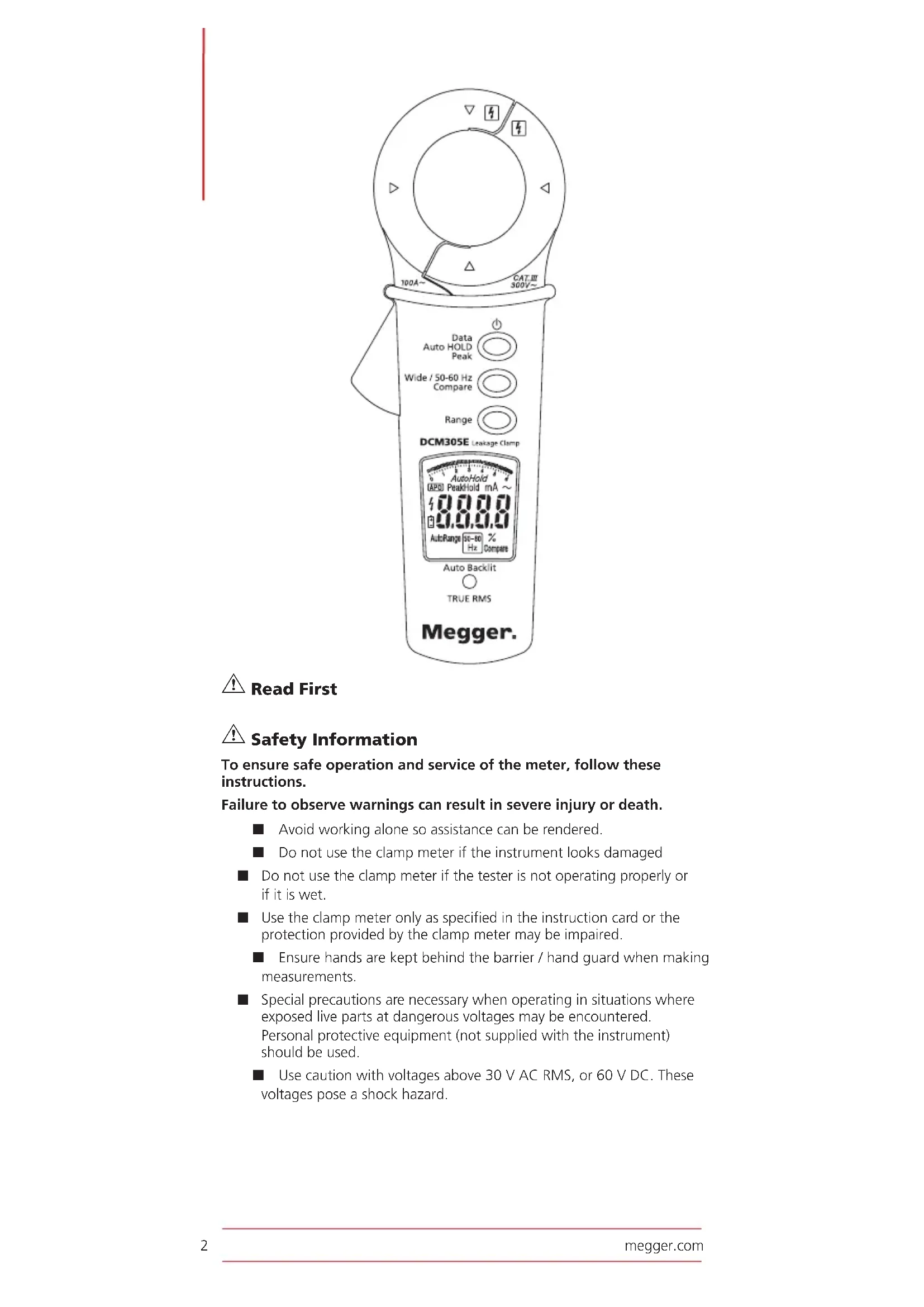 User manual P 2 Benutzerhandbuch P17 Manuel utilisateur P33 Guía del usuario P49 Gebruikershandleiding P65 DCM305E Earth Leakage Clampmeter2 megger.com G Read First G Safety Information To ensure safe operation and service of the meter, follow these instructions. Failure to observe warnings can result in severe injury or death. ■ Avoid working alone so assistance can be rendered. ■ Do not use the clamp meter if the instrument looks damaged ■ Do not use the clamp meter if the tester is not operating properly or if it is wet. ■ Use the clamp meter only as specified in the instruction card or the protection provided by the clamp meter may be impaired. ■ Ensure hands are kept behind the barrier / hand guard when making measurements. ■ Special precautions are necessary when operating in situations where exposed live parts at dangerous voltages may be encountered. Personal protective equipment (not supplied with the instrument) should be used. ■ Use caution with voltages above 30 V AC RMS, or 60 V DC. These voltages pose a shock hazard.3 megger.com CAT IV Measurement category IV: Equipment connected between the origin of the low-voltage mains supply outside the building and the consumer unit. CAT III Measurement category III: Equipment connected between the consumer unit and the electrical outlets. CAT II Measurement category II: Equipment connected between the electrical outlets and the user’s equipment. Symbols as marked on the instrument and instruction card
