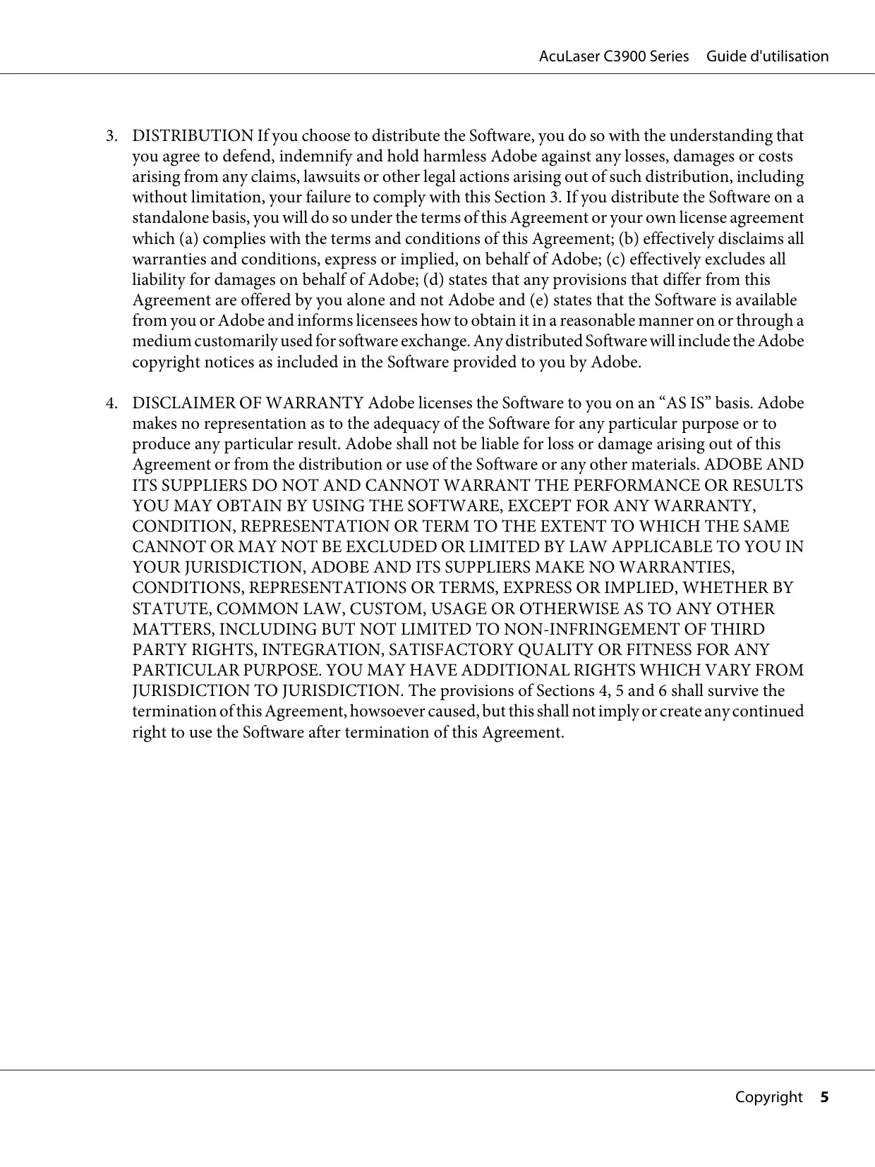 3. DISTRIBUTION If you choose to distribute the Software, you do so with the understanding that you agree to defend, indemnify and hold harmless Adobe against any losses, damages or costs arising from any claims, lawsuits or other legal actions arising out of such distribution, including without limitation, your failure to comply with this Section 3. If you distribute the Software on a standalone basis, you will do so under the terms of this Agreement or your own license agreement which (a) complies with the terms and conditions of this Agreement; (b) effectively disclaims all warranties and conditions, express or implied, on behalf of Adobe; (c) effectively excludes all liability for damages on behalf of Adobe; (d) states that any provisions that differ from this Agreement are offered by you alone and not Adobe and (e) states that the Software is available from you or Adobe and informs licensees how to obtain it in a reasonable manner on or through a medium customarily used for software exchange. Any distributed Software will include the Adobe copyright notices as included in the Software provided to you by Adobe. 4. DISCLAIMER OF WARRANTY Adobe licenses the Software to you on an “AS IS” basis. Adobe makes no representation as to the adequacy of the Software for any particular purpose or to produce any particular result. Adobe shall not be liable for loss or damage arising out of this Agreement or from the distribution or use of the Software or any other materials. ADOBE AND ITS SUPPLIERS DO NOT AND CANNOT WARRANT THE PERFORMANCE OR RESULTS YOU MAY OBTAIN BY USING THE SOFTWARE, EXCEPT FOR ANY WARRANTY, CONDITION, REPRESENTATION OR TERM TO THE EXTENT TO WHICH THE SAME CANNOT OR MAY NOT BE EXCLUDED OR LIMITED BY LAW APPLICABLE TO YOU IN YOUR JURISDICTION, ADOBE AND ITS SUPPLIERS MAKE NO WARRANTIES, CONDITIONS, REPRESENTATIONS OR TERMS, EXPRESS OR IMPLIED, WHETHER BY STATUTE, COMMON LAW, CUSTOM, USAGE OR OTHERWISE AS TO ANY OTHER MATTERS, INCLUDING BUT NOT LIMITED TO NON-INFRINGEMENT OF THIRD PARTY RIGHTS, INTEGRATION, SATISFACTORY QUALITY OR FITNESS FOR ANY PARTICULAR PURPOSE. YOU MAY HAVE ADDITIONAL RIGHTS WHICH VARY FROM JURISDICTION TO JURISDICTION. The provisions of Sections 4, 5 and 6 shall survive the termination of this Agreement, howsoever caused, but this shall not imply or create any continued right to use the Software after termination of this Agreement.