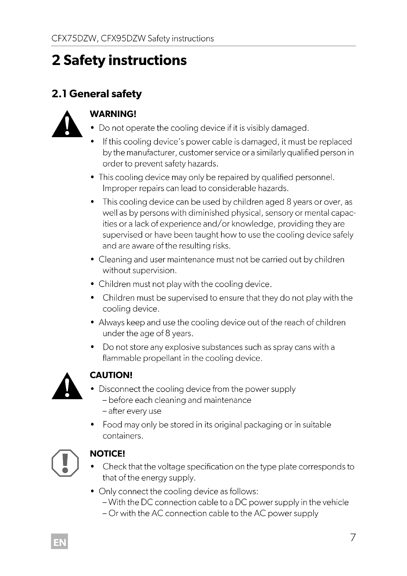 - Only connect the cooling device as follows: – With the DC connection cable to a DC power supply in the vehicle – Or with the AC connection cable to the AC power supply CFX75_95DZW--O-16s.book Seite 7 Montag, 14. August 2017 4:29 16EN Safety instructions CFX75DZW, CFX95DZW